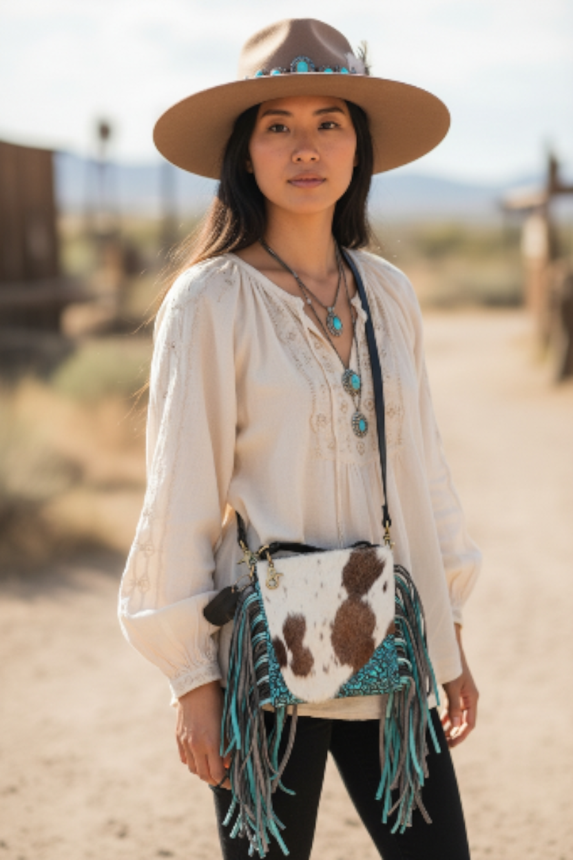 • Voorzijde van prachtig bewerkt leer, turquoise en zwart, bovenzijde sluit met een rits
