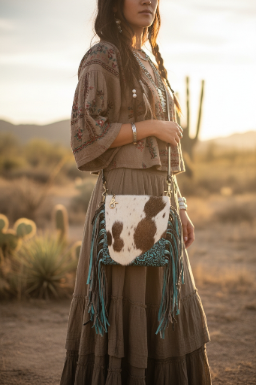 • Zijkanten voorzien van frings, bruin met turquoise