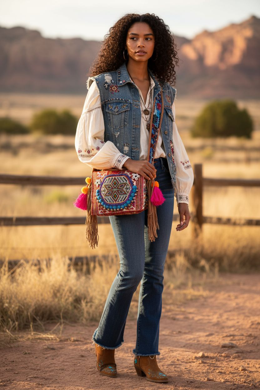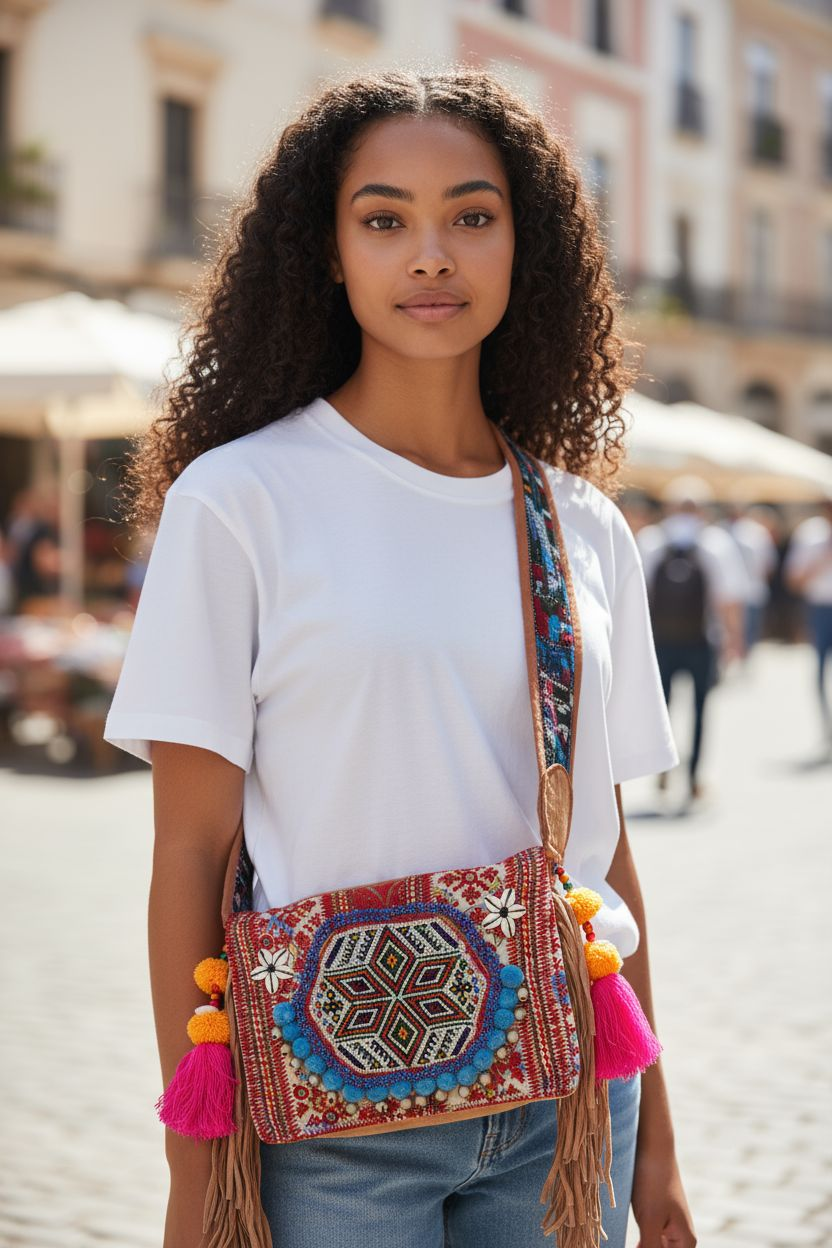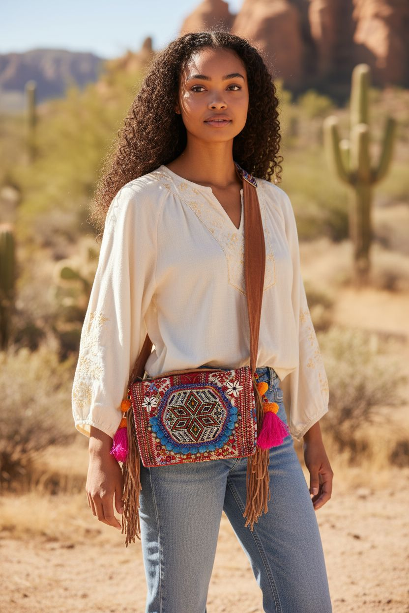 • Voorklep met banjara applicatie met zilveren muntjes, schelpjes, kraaltjes & spiegeltjes...elke tas is echt uniek!