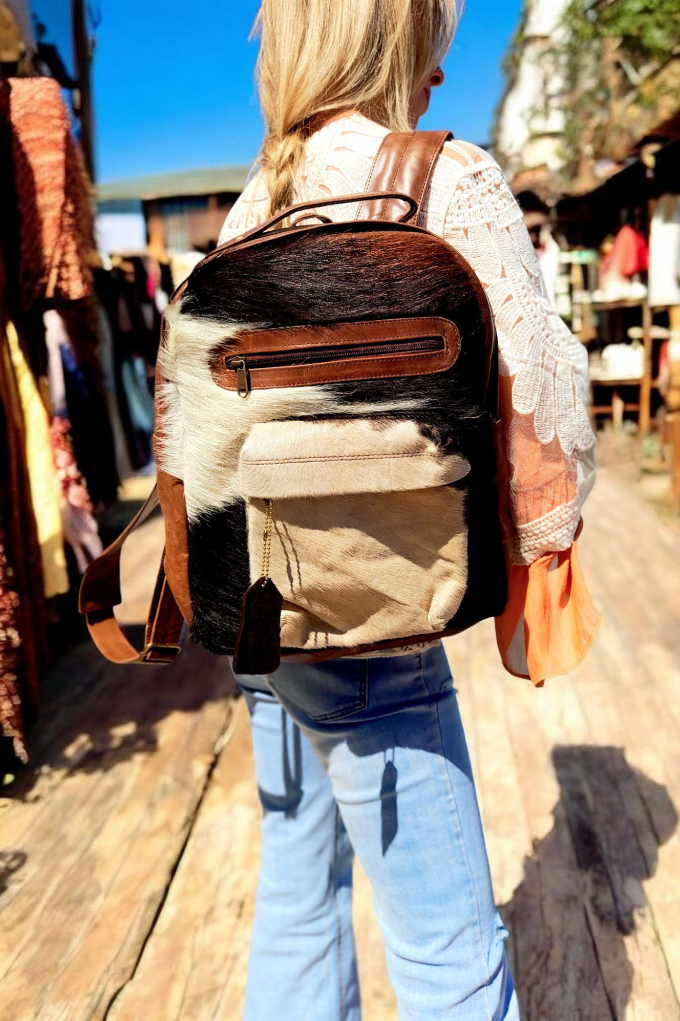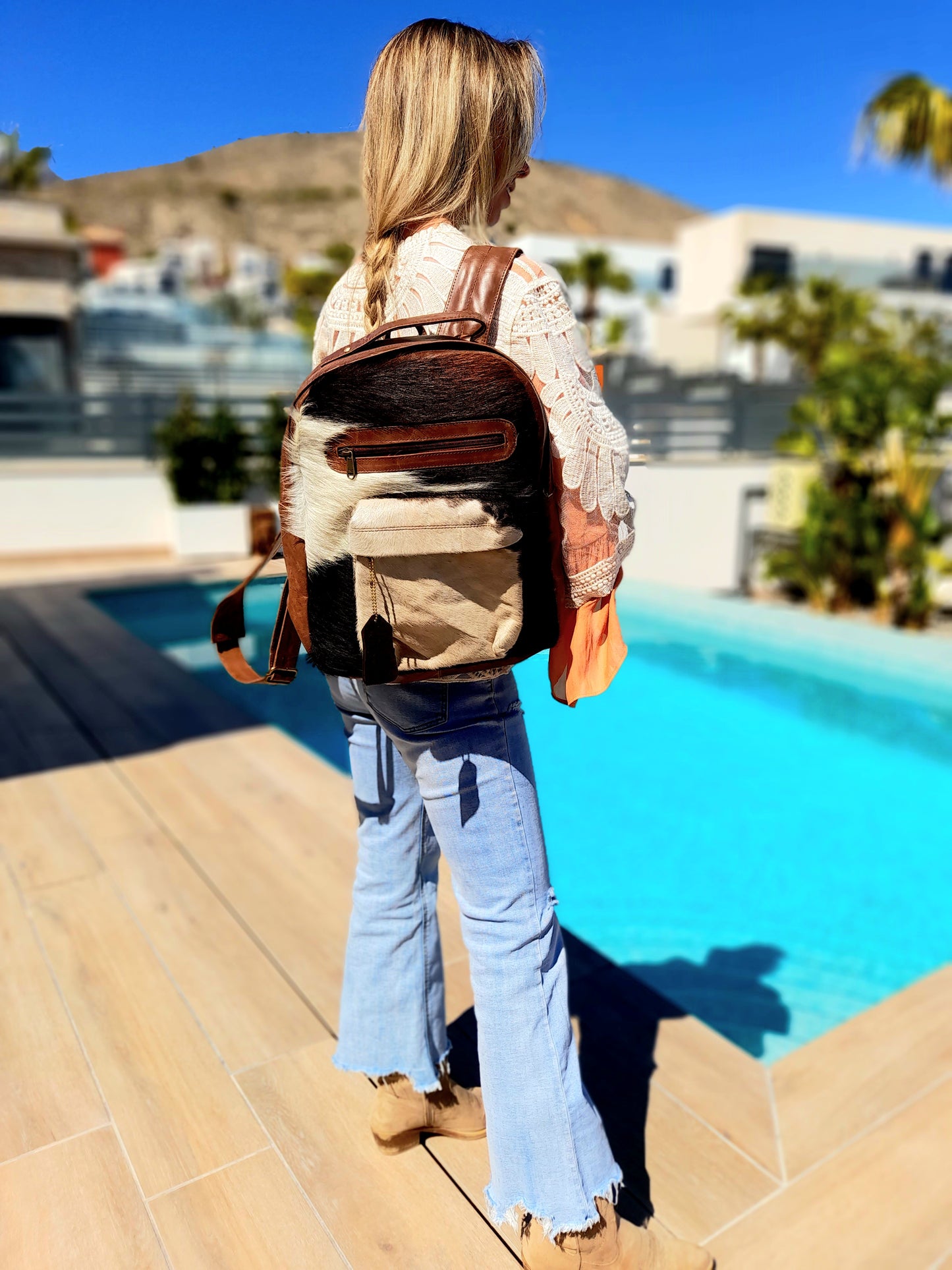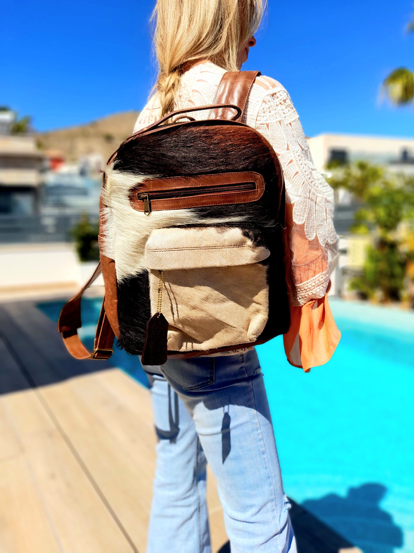 • Voorkant van huid met leren bies, sluit en 2 grote voorvakken met rits om spulletjes in op te bergen