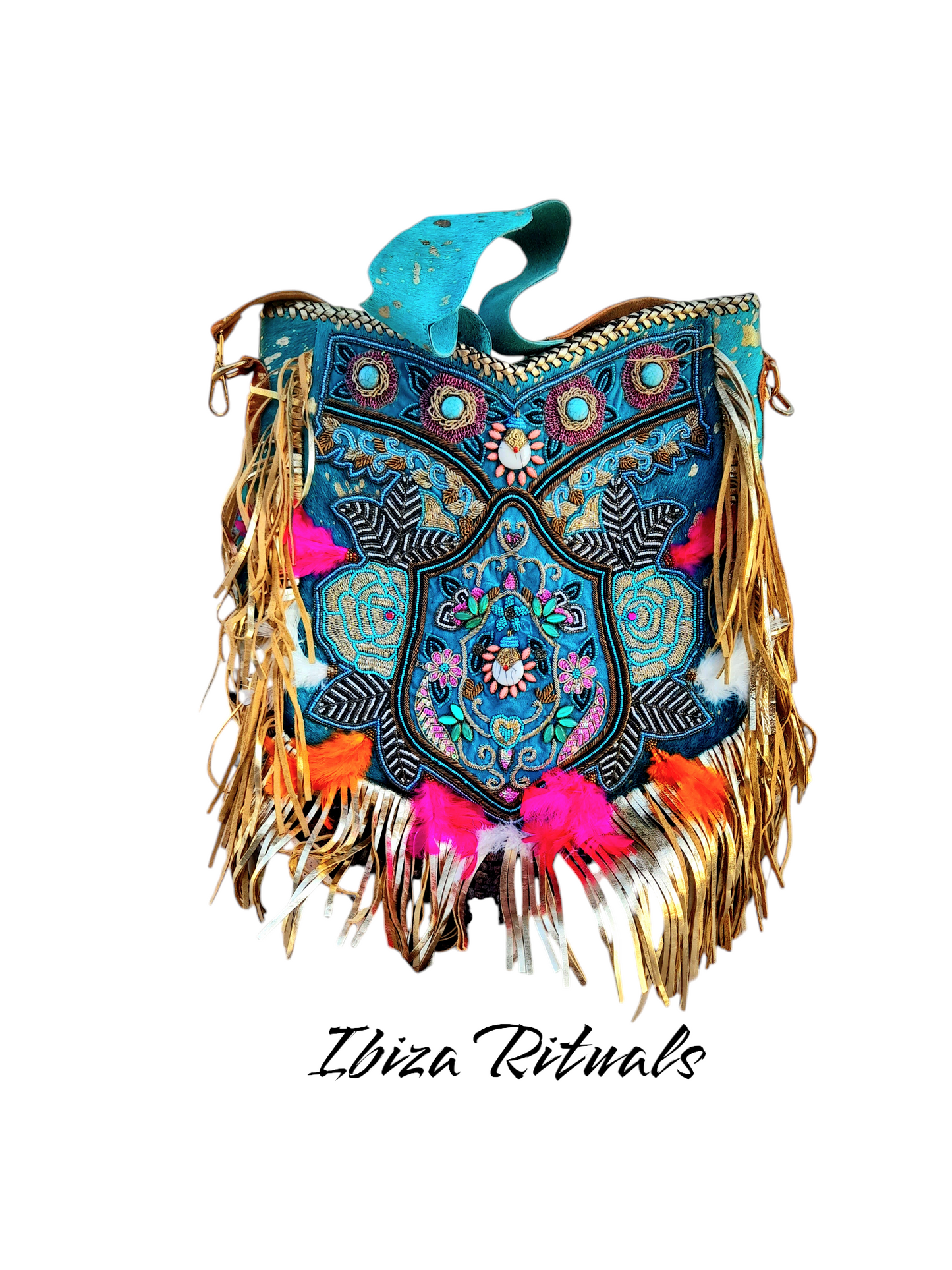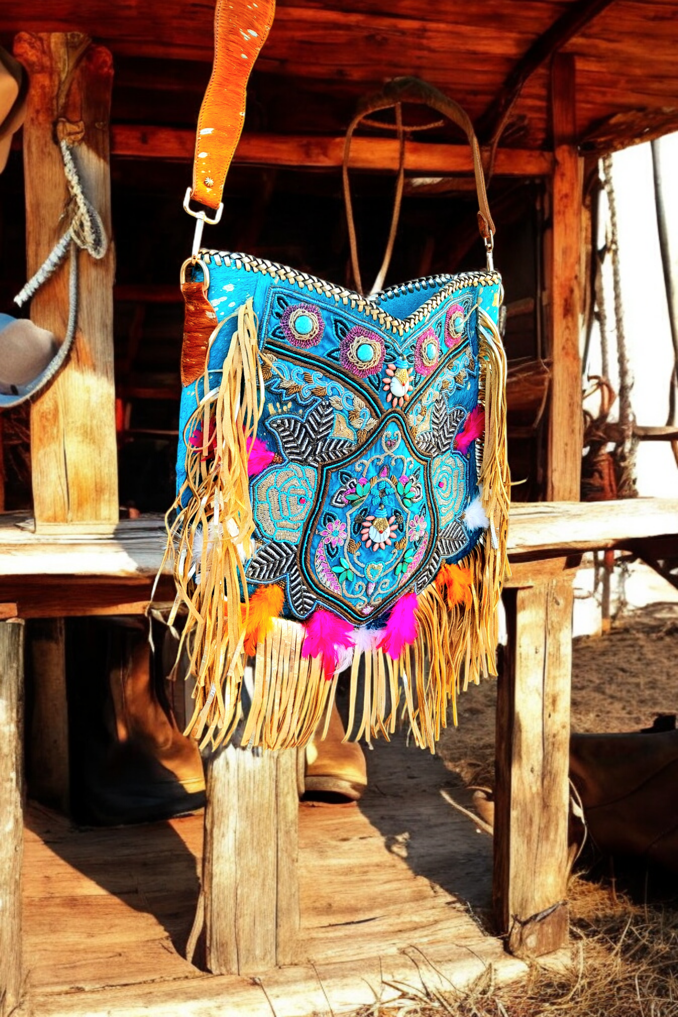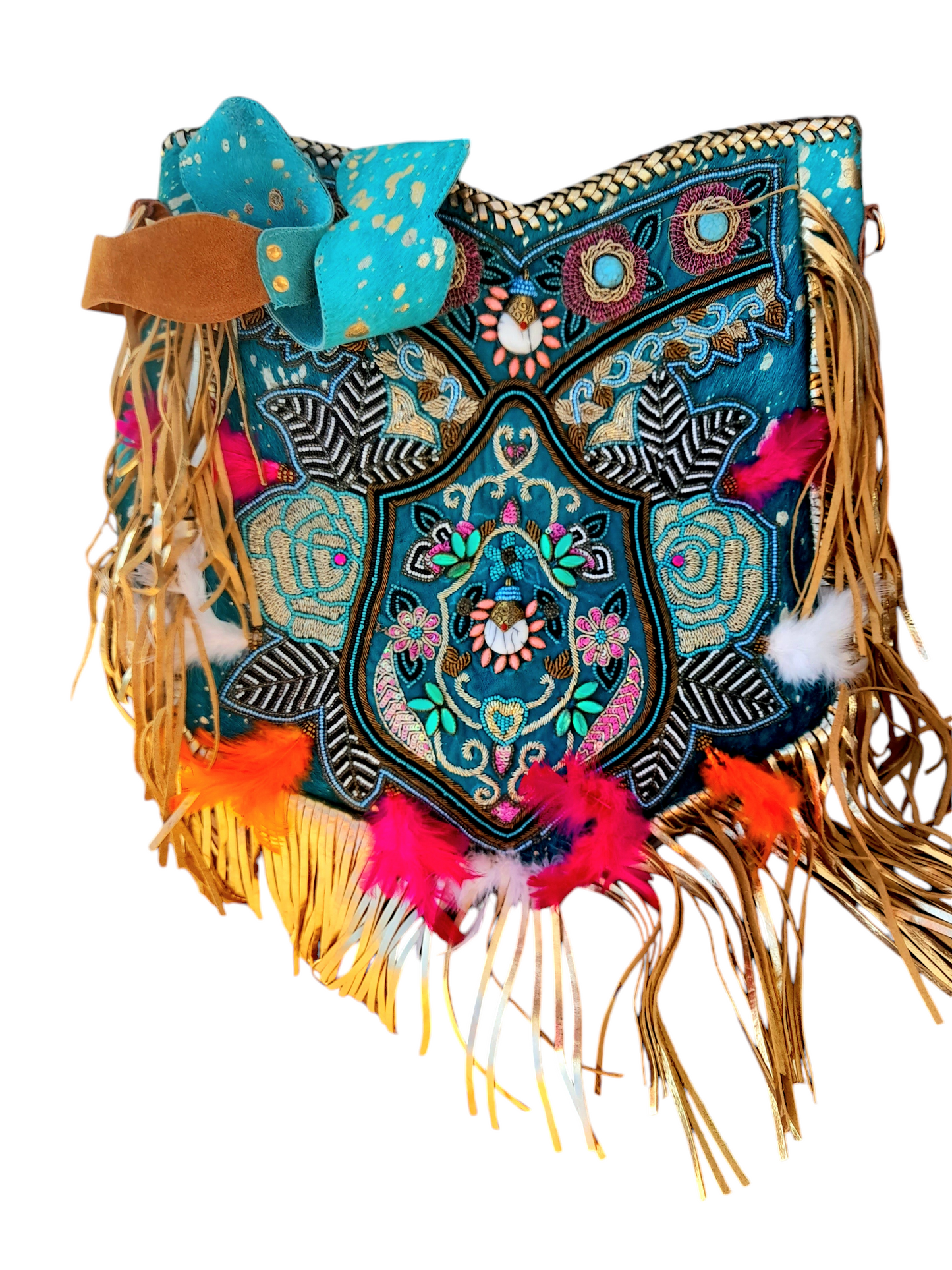 • Prachtige geborduurde Boho tas, afgezet met turquoise steentjes prachtige borduring met kraaltjes en gekleurde veertjes!