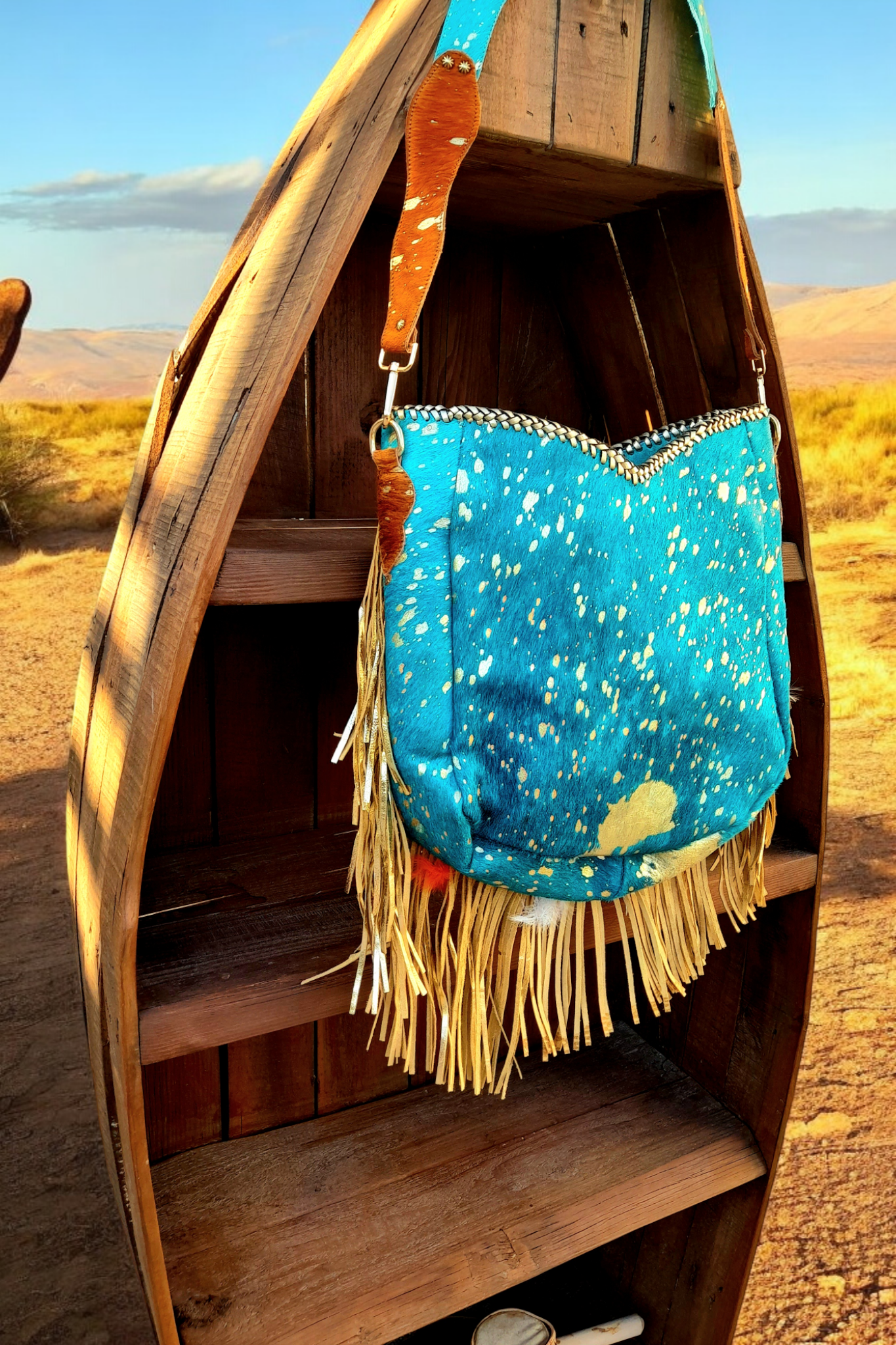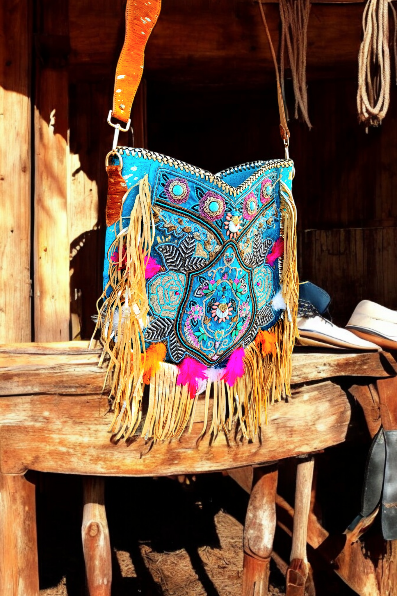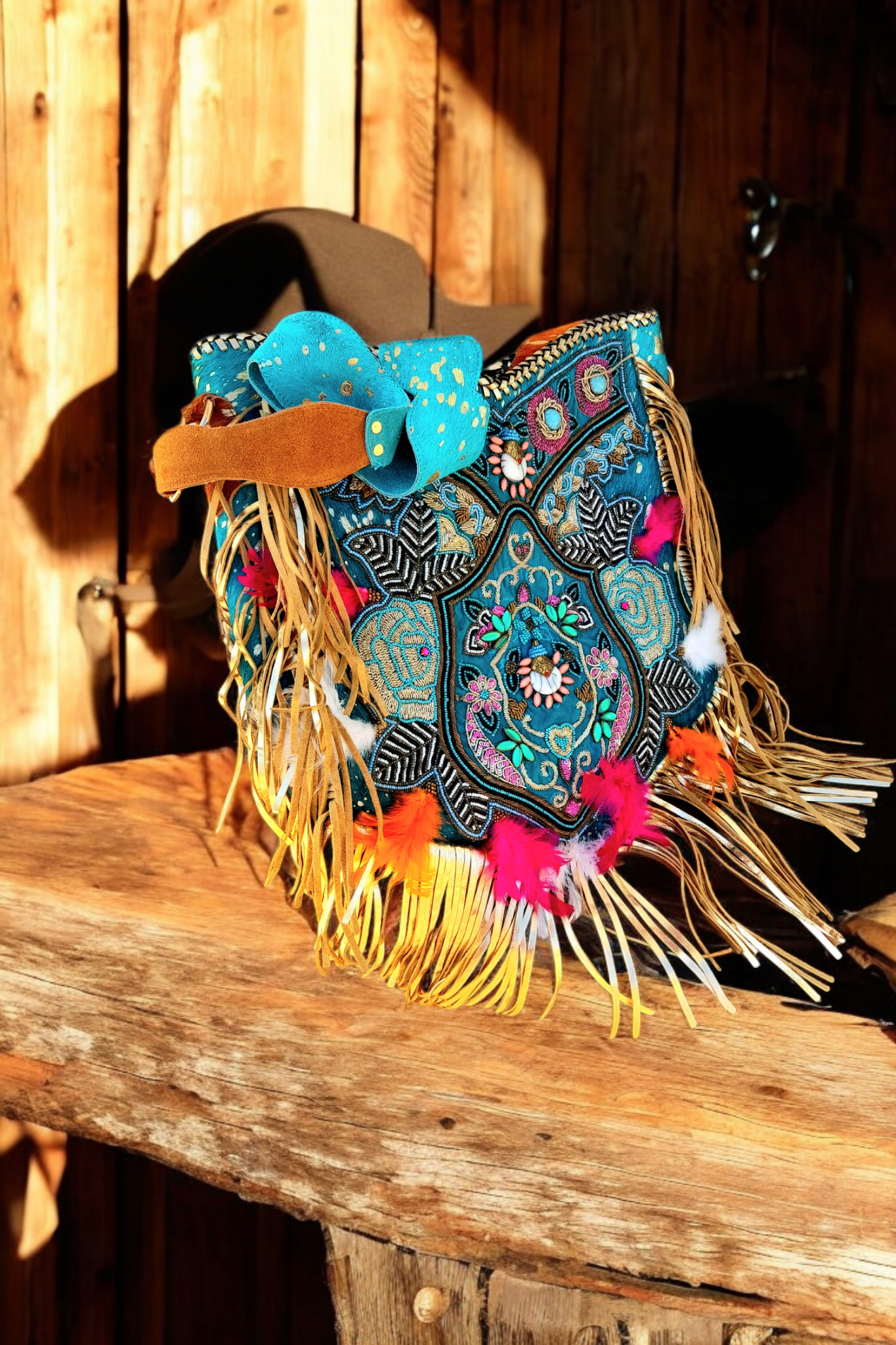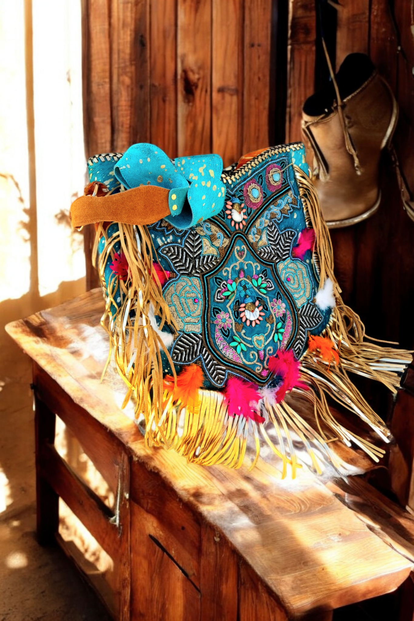• Prachtige geborduurde Boho tas, afgezet met turquoise steentjes prachtige borduring met kraaltjes en gekleurde veertjes!