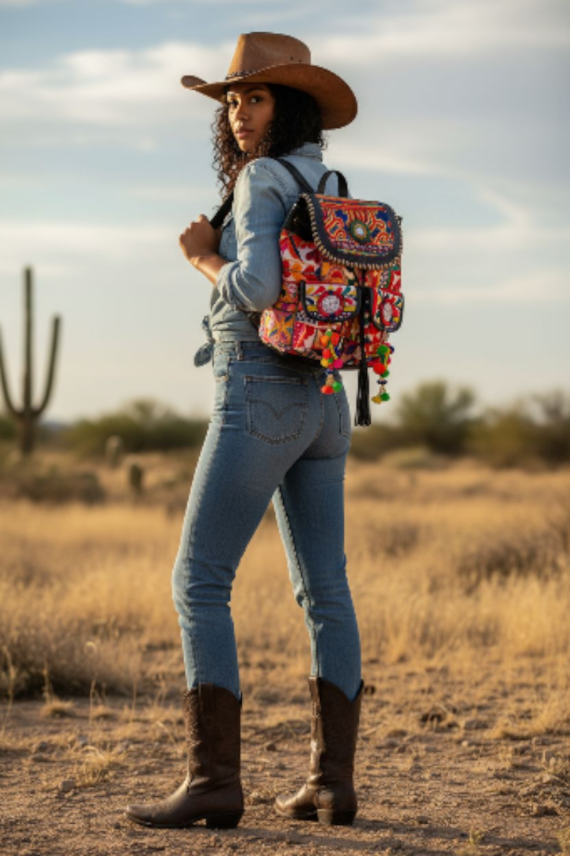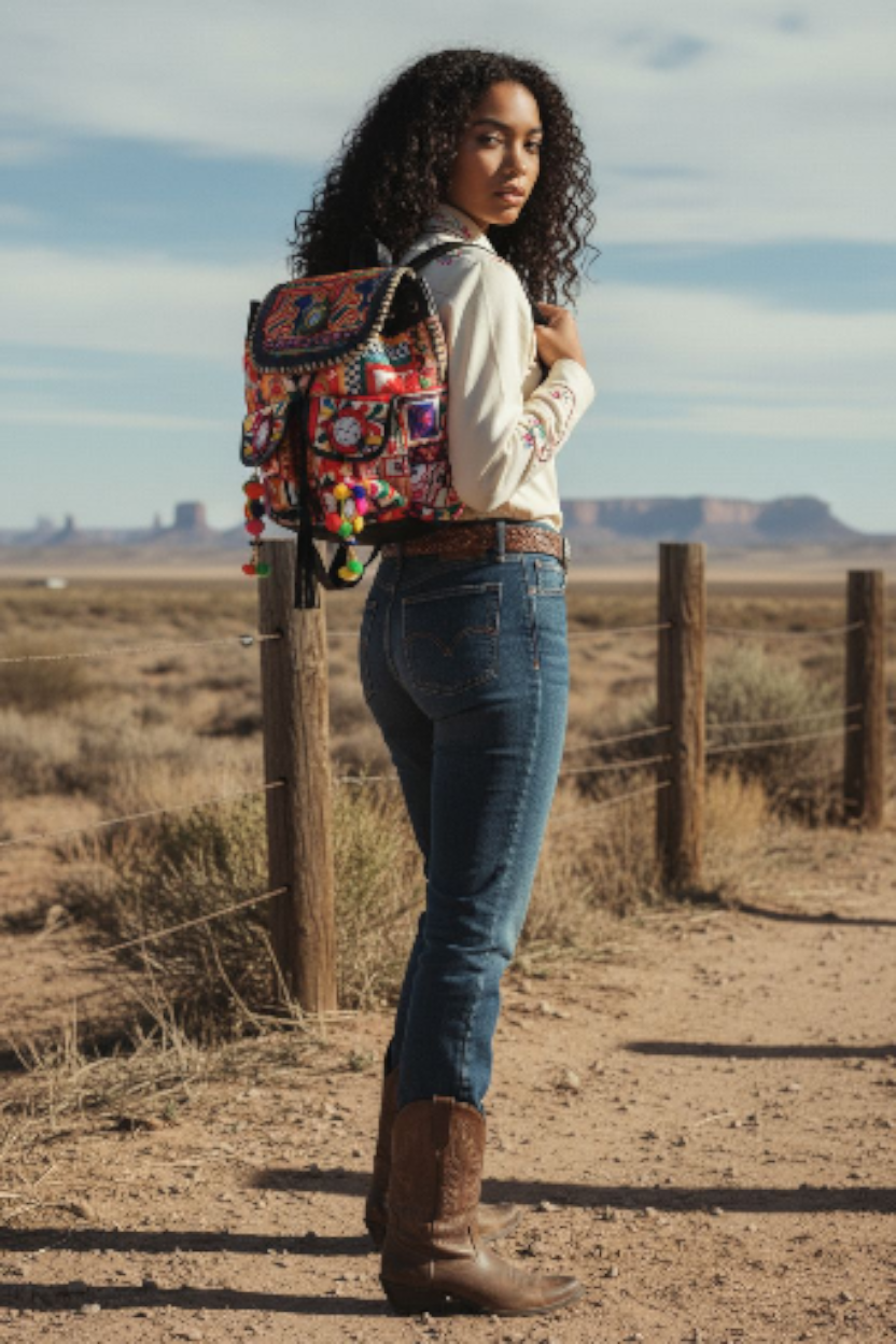 • Solapa frontal de tela azteca y cuero, se cierra con pulsador