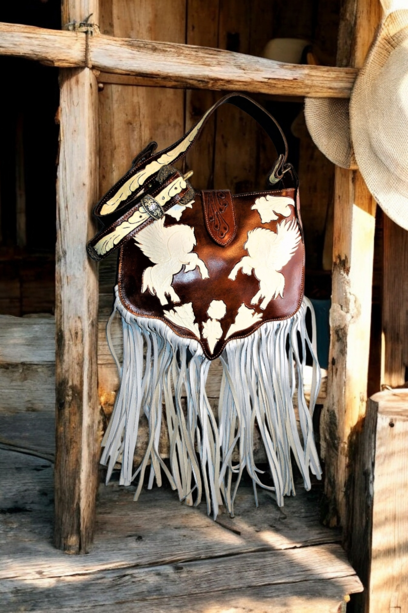 • Adornado con flecos de cuero y