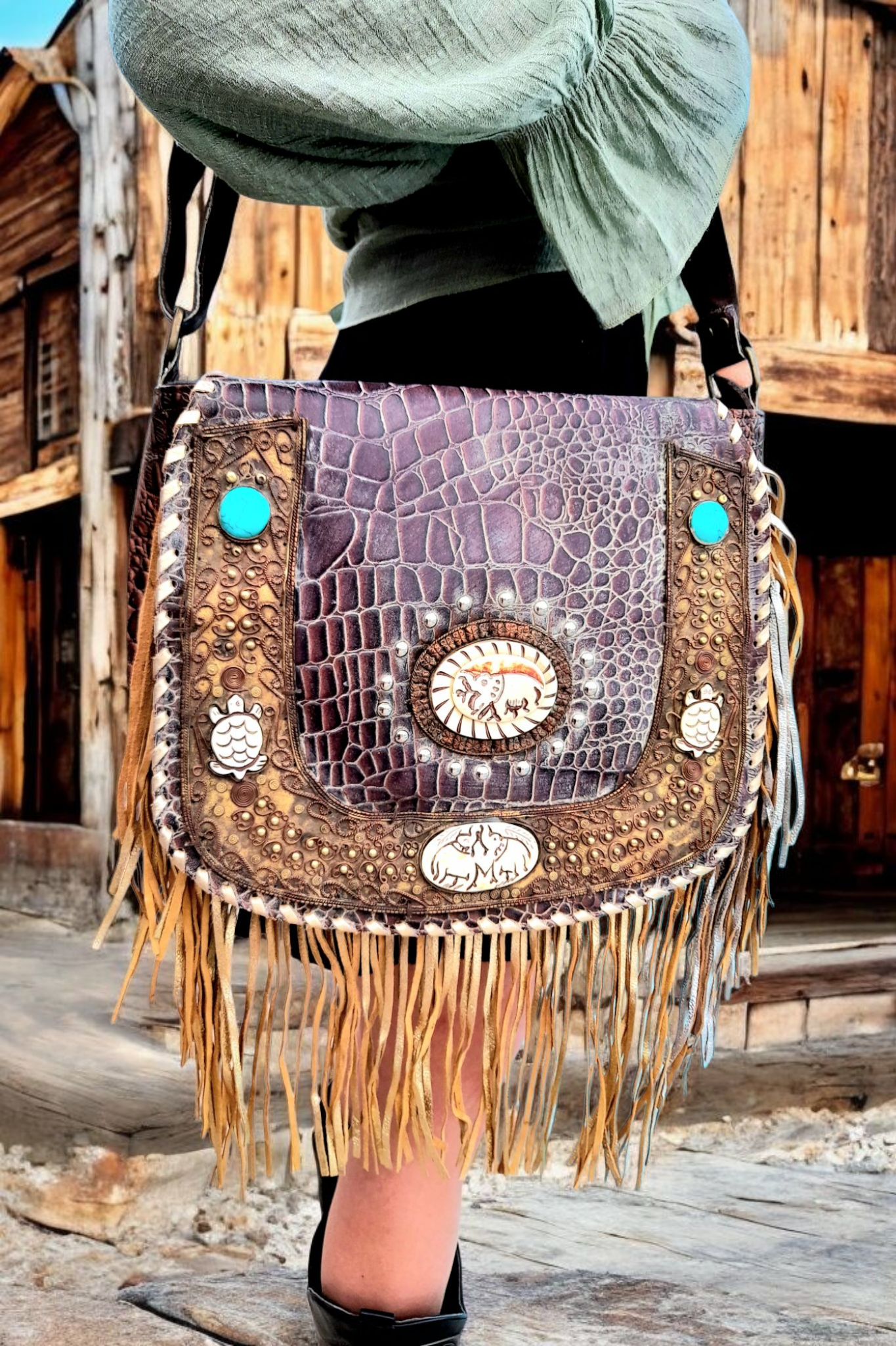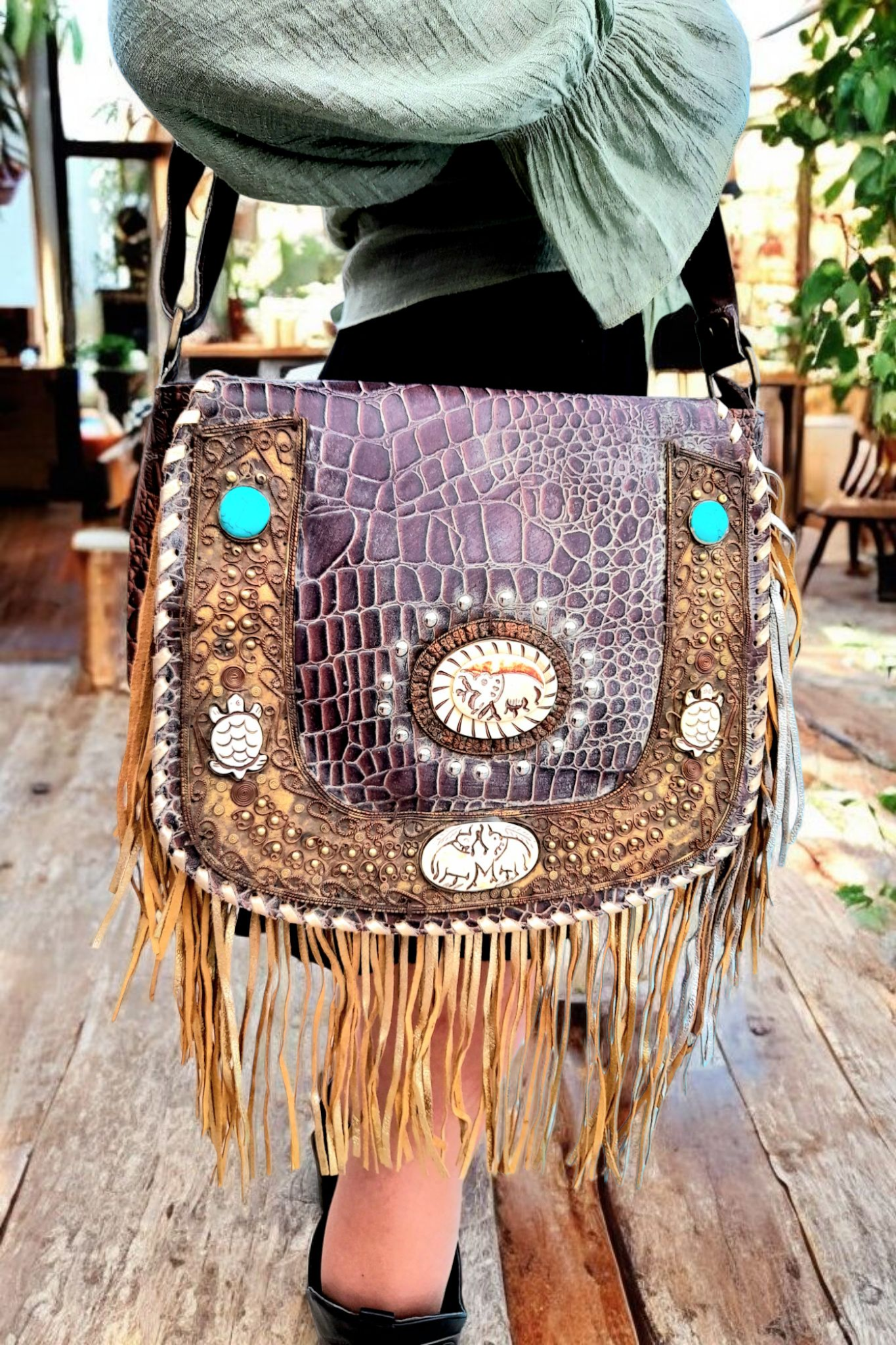 • Voorzijde van huid & prachtige koperkleurige metalen rand, afgezet met mooie applicaties, turquoise steentjes enz...