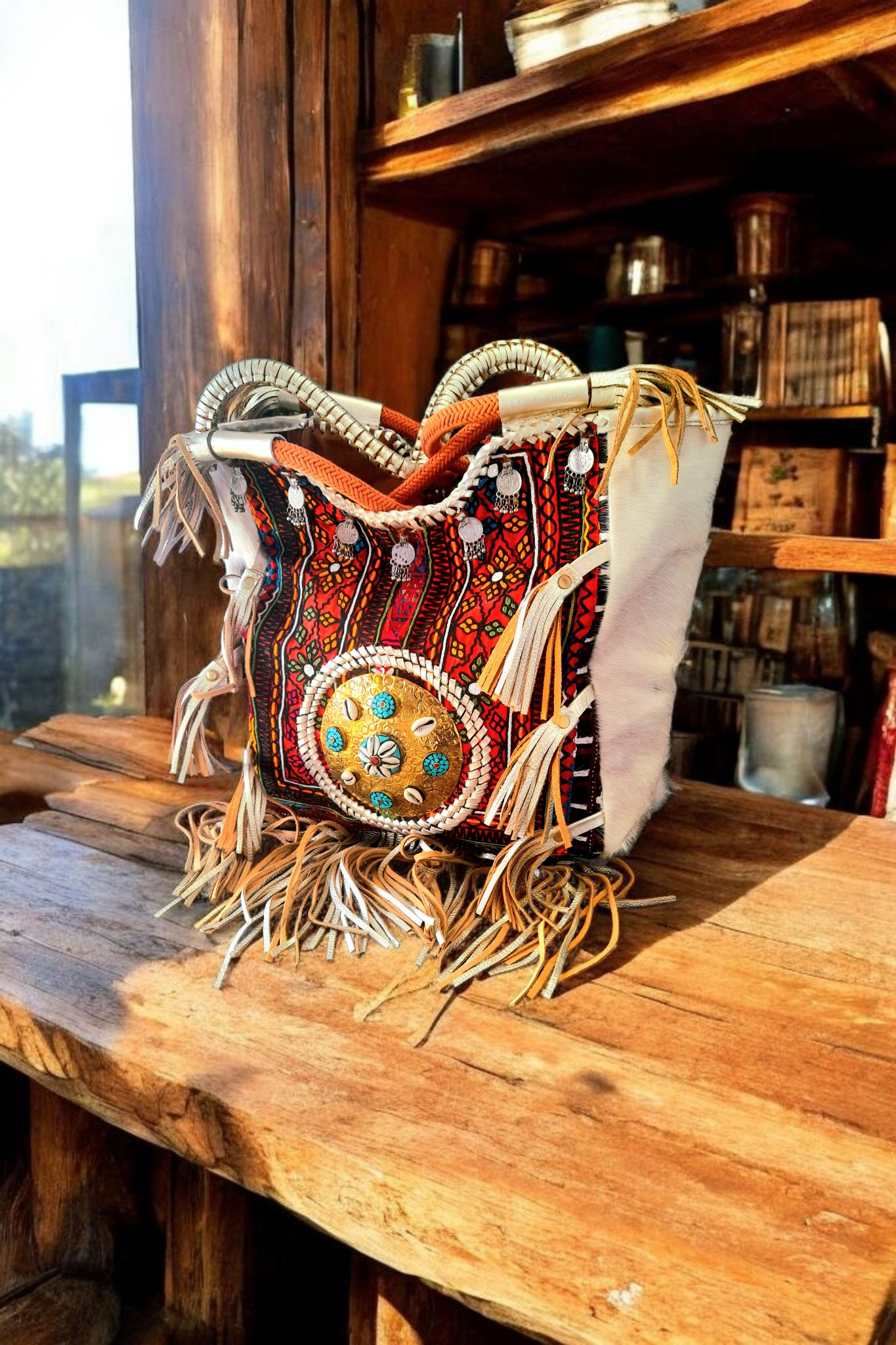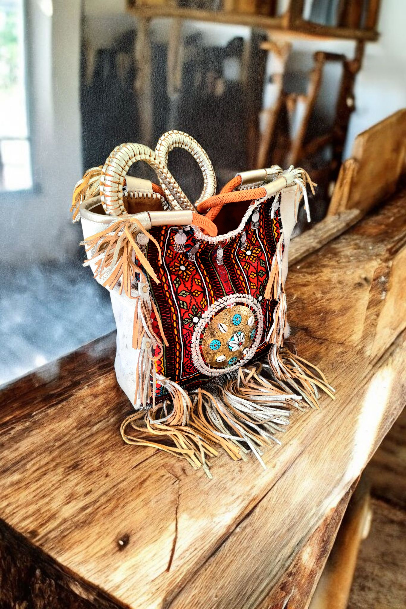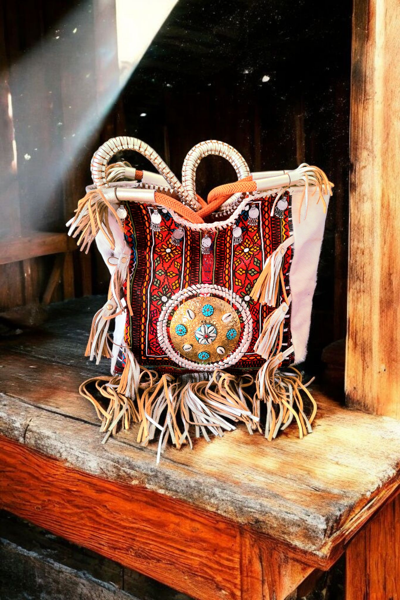 • Afgezet met leren frings, flosjes en leer om het ornament