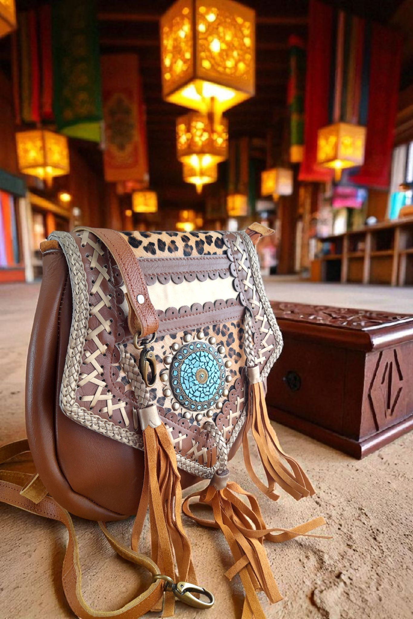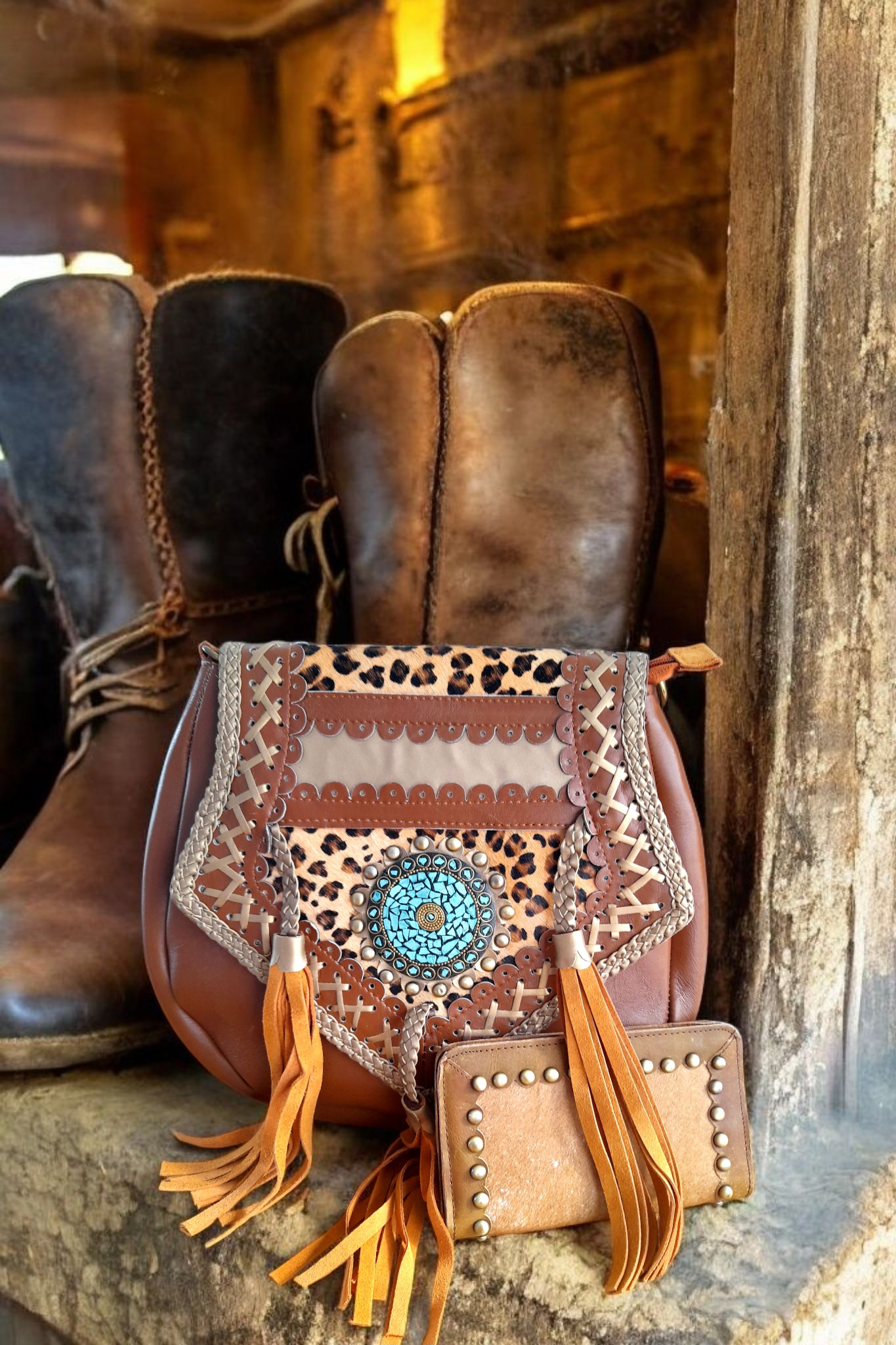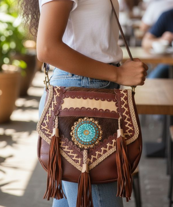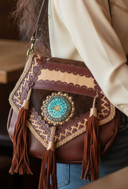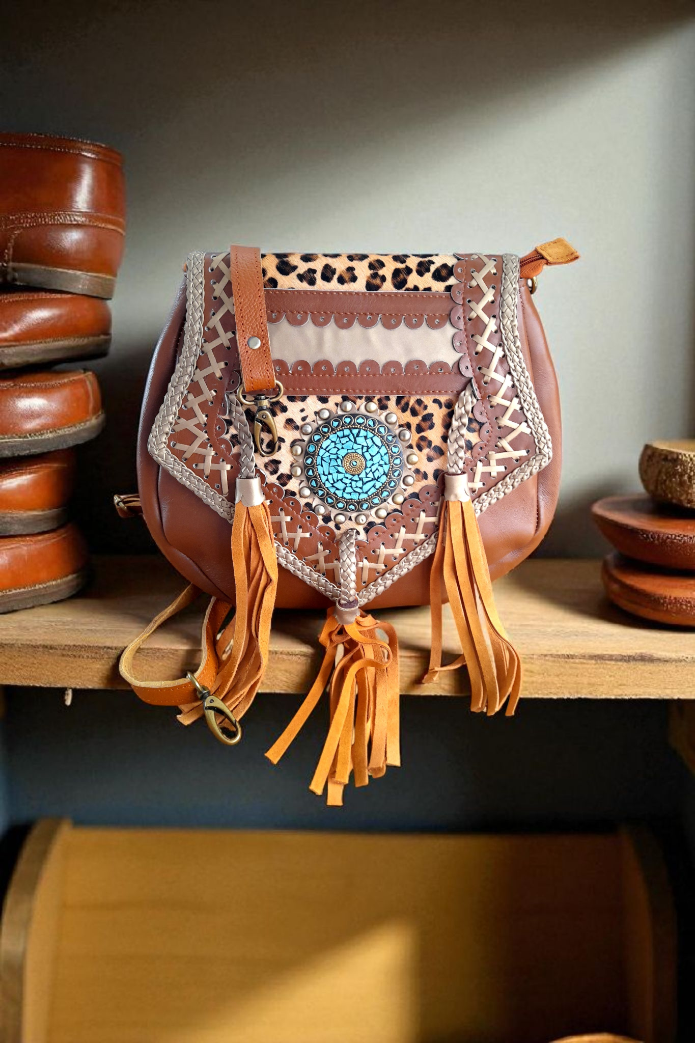 • Voorzijde flap van bruin leer met applicatie met prachtige turquoise steenstjes, gevlochten leer met suede flosjes en bronskleurige studs