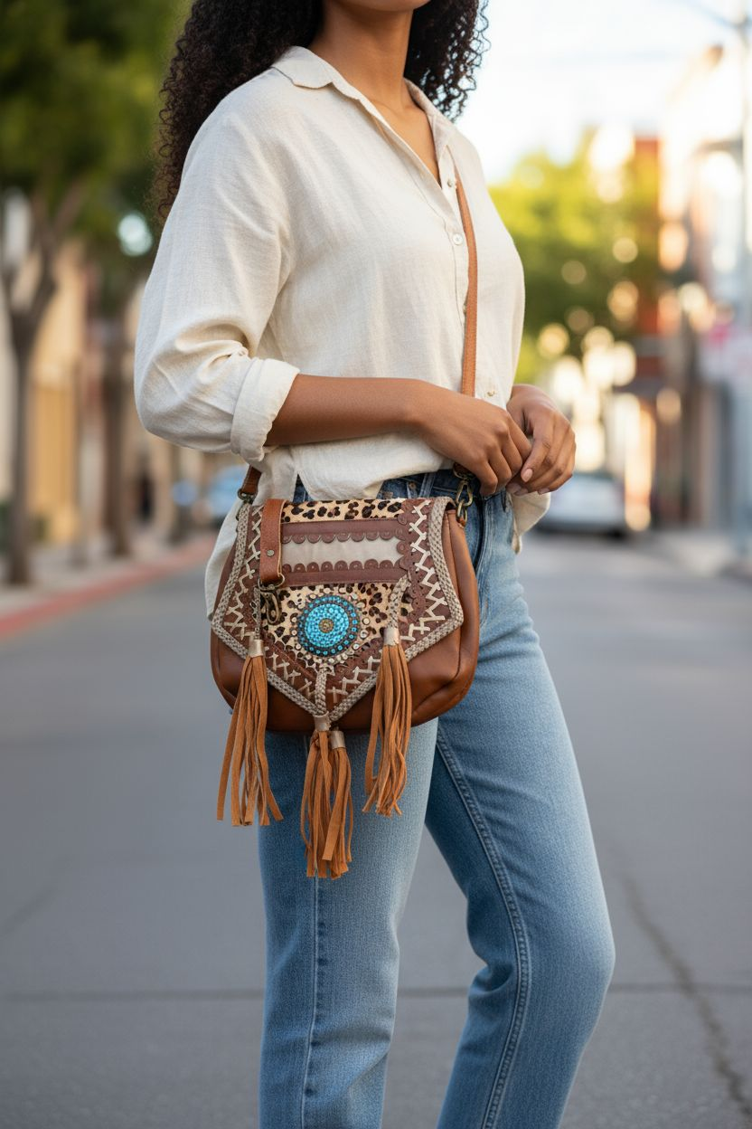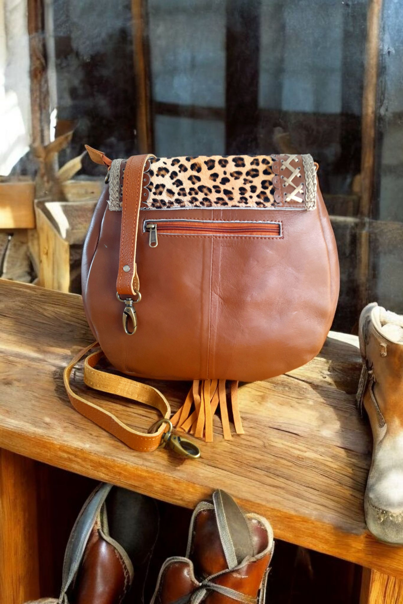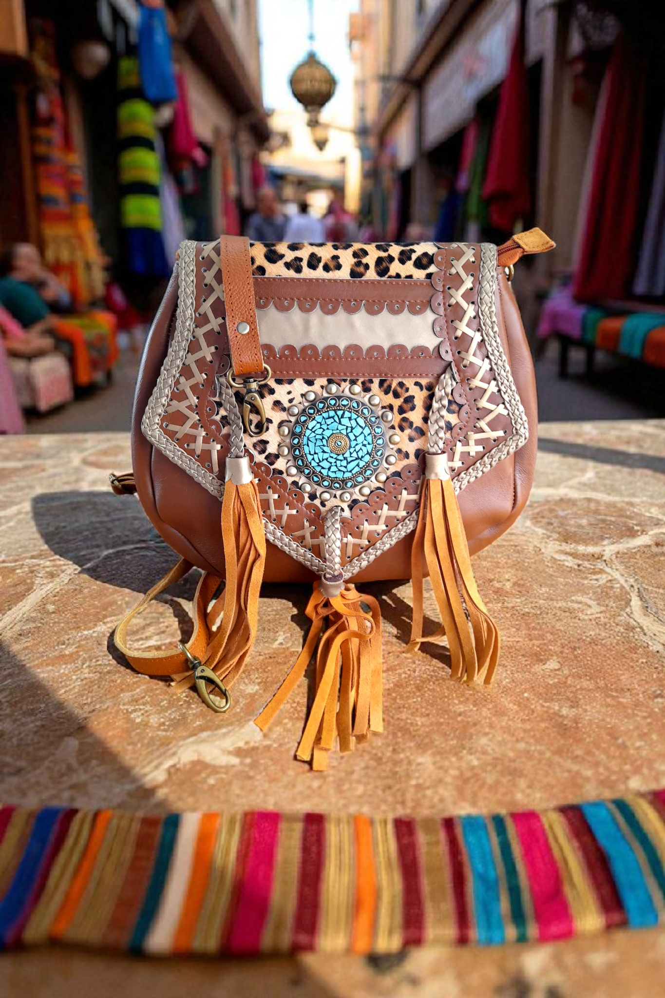 • Voorzijde flap van bruin leer met applicatie met prachtige turquoise steenstjes, gevlochten leer met suede flosjes en bronskleurige studs