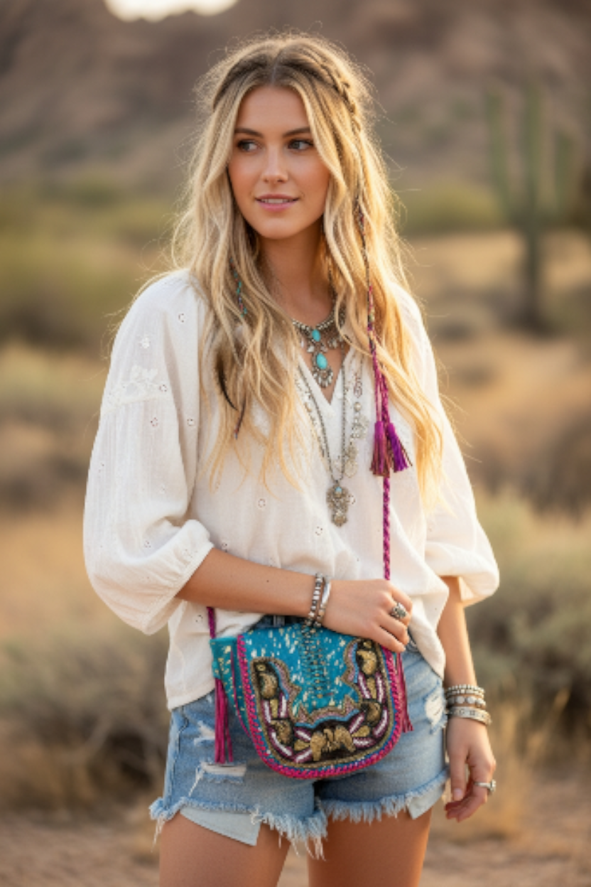 •  Voorzijde van turquoise huid met gouden accenten, afgezet met oosterse applicatie van verschillende kleuren kraaltjes