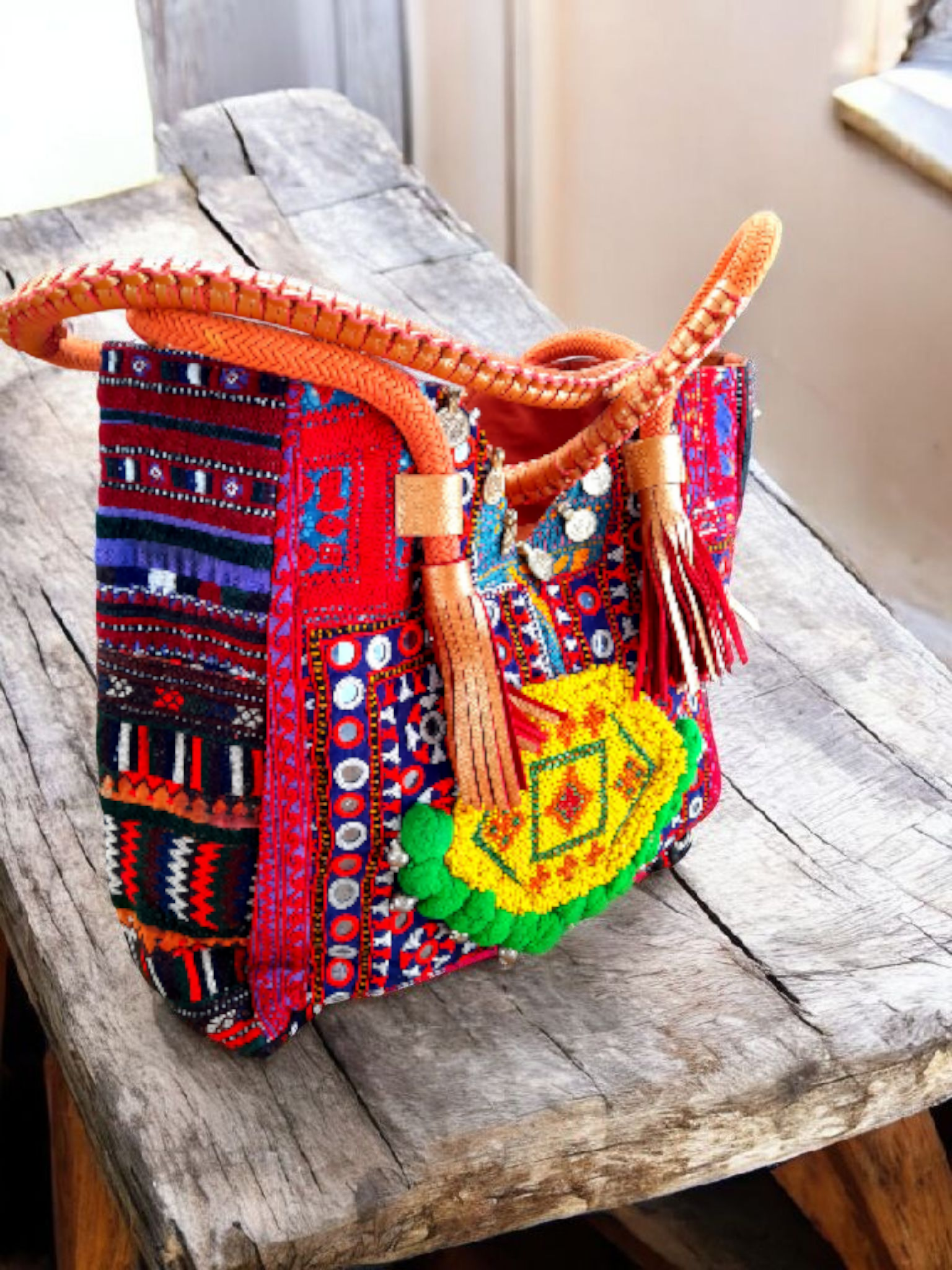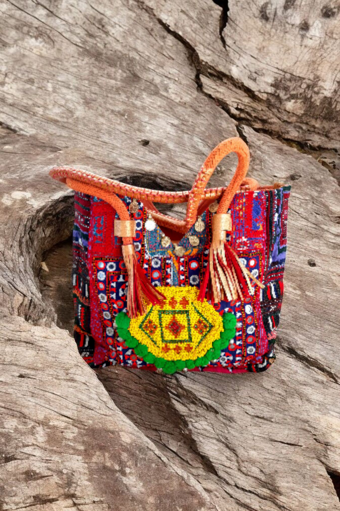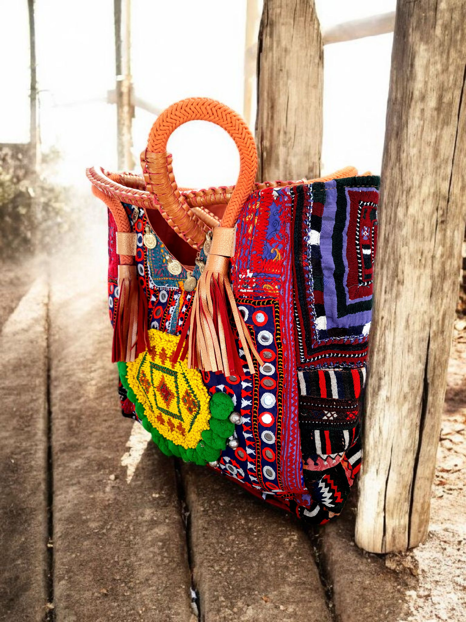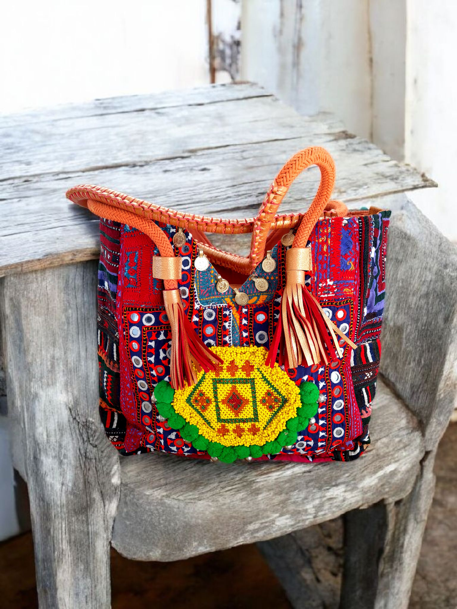 • Voorzijde van prachtige aztec stof met gave banjara applicatie van kleine kraaltjes afgezet met zilveren muntjes en pompoentjes....elke tas is echt uniek!