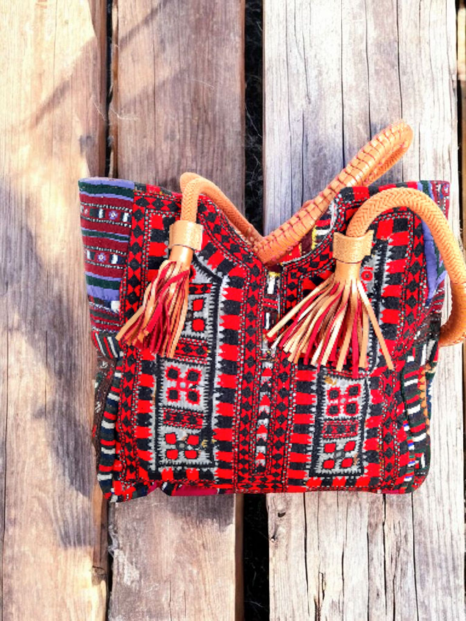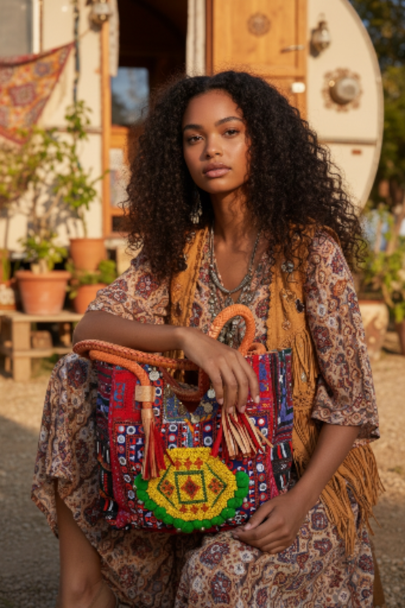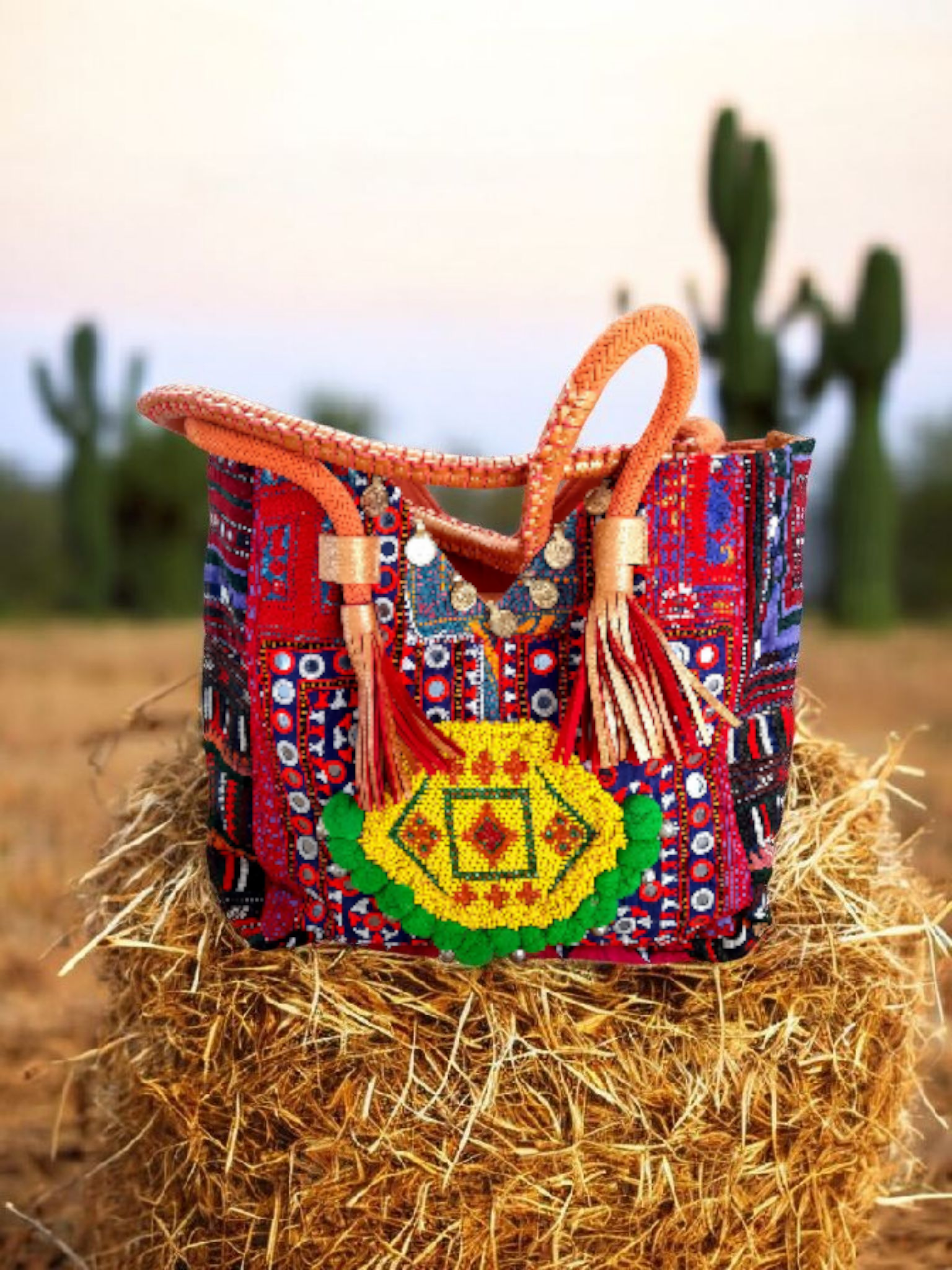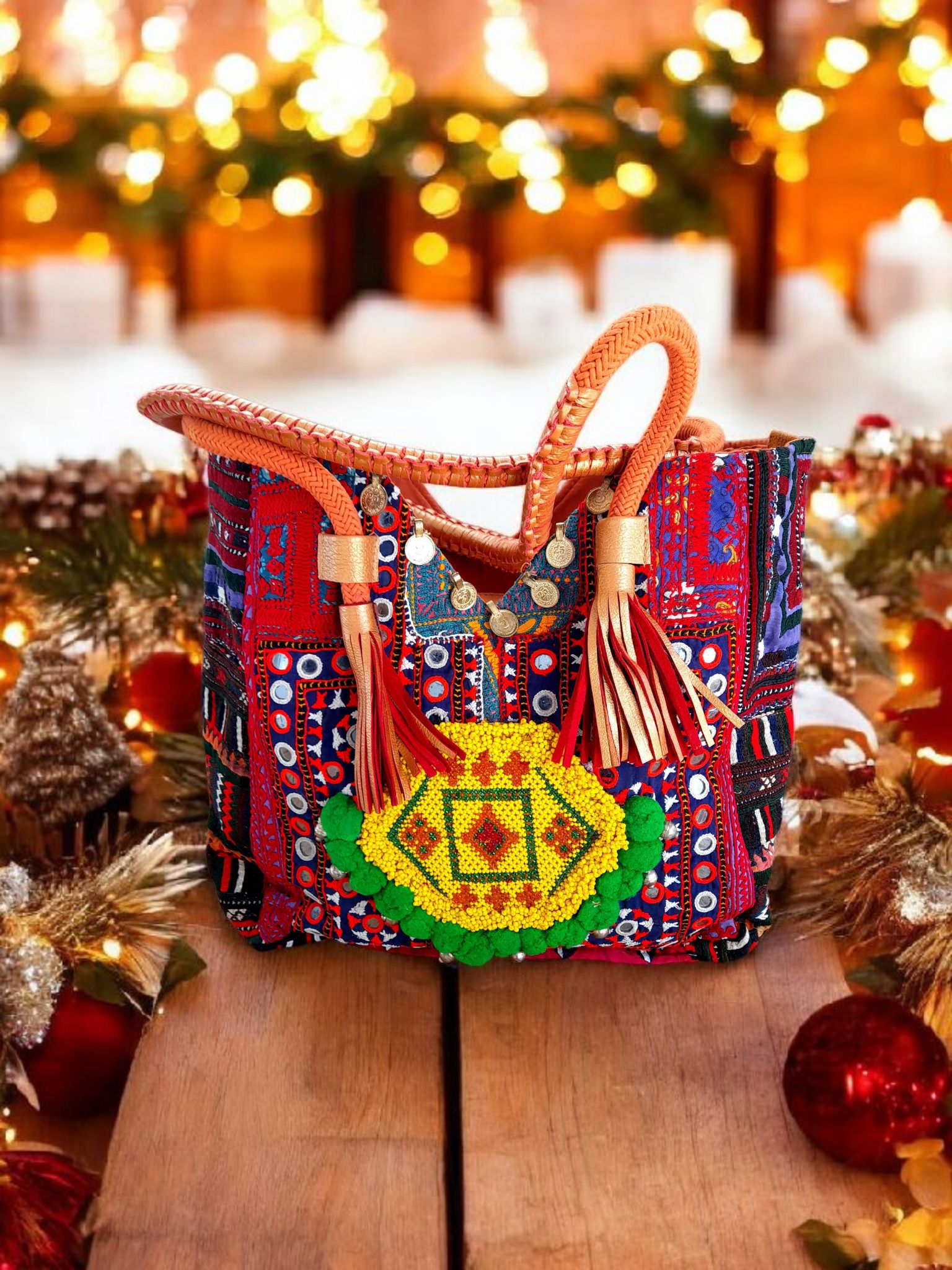 • Voorzijde van prachtige aztec stof met gave banjara applicatie van kleine kraaltjes afgezet met zilveren muntjes en pompoentjes....elke tas is echt uniek!