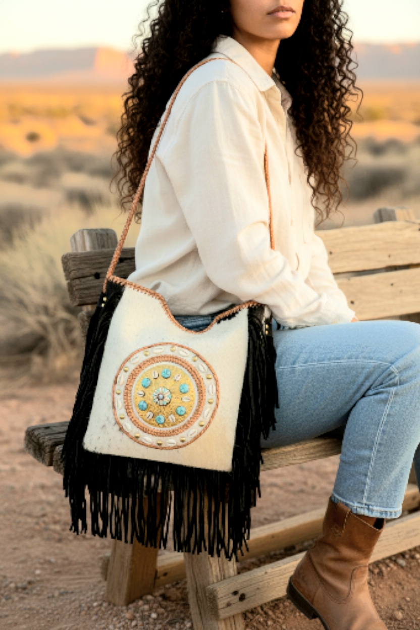 • Voor en achterzijde van koeienhuid, afgezet met gevlochten lederen bies