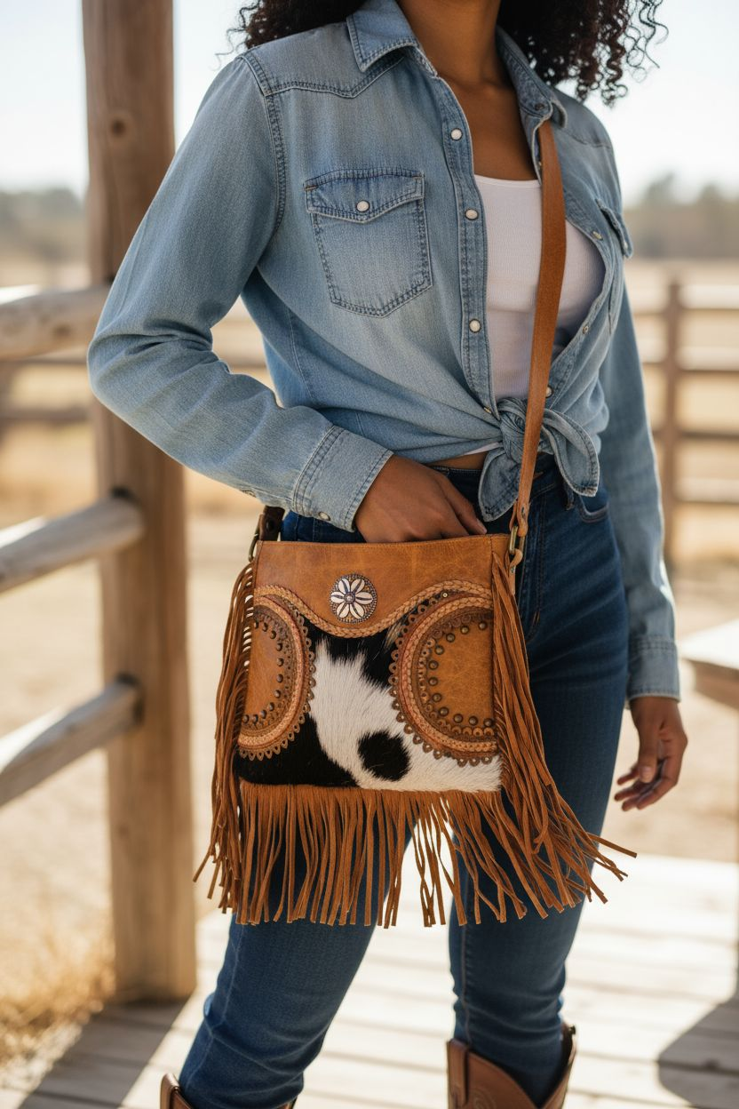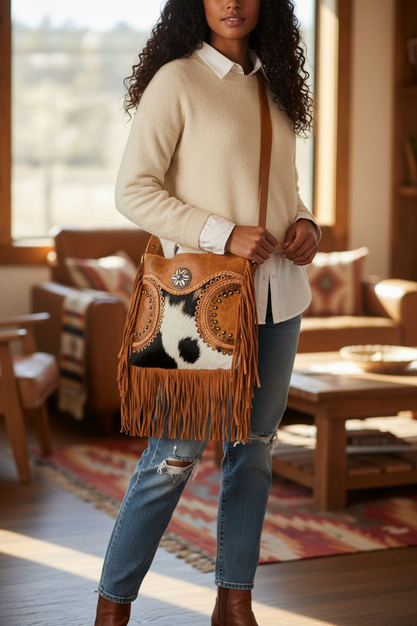 • Voorzijde van koeienhuid en puur soepel leer, met aplicatie van schelpjes en steentjes