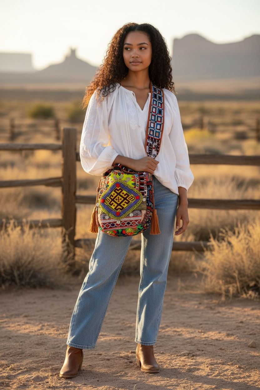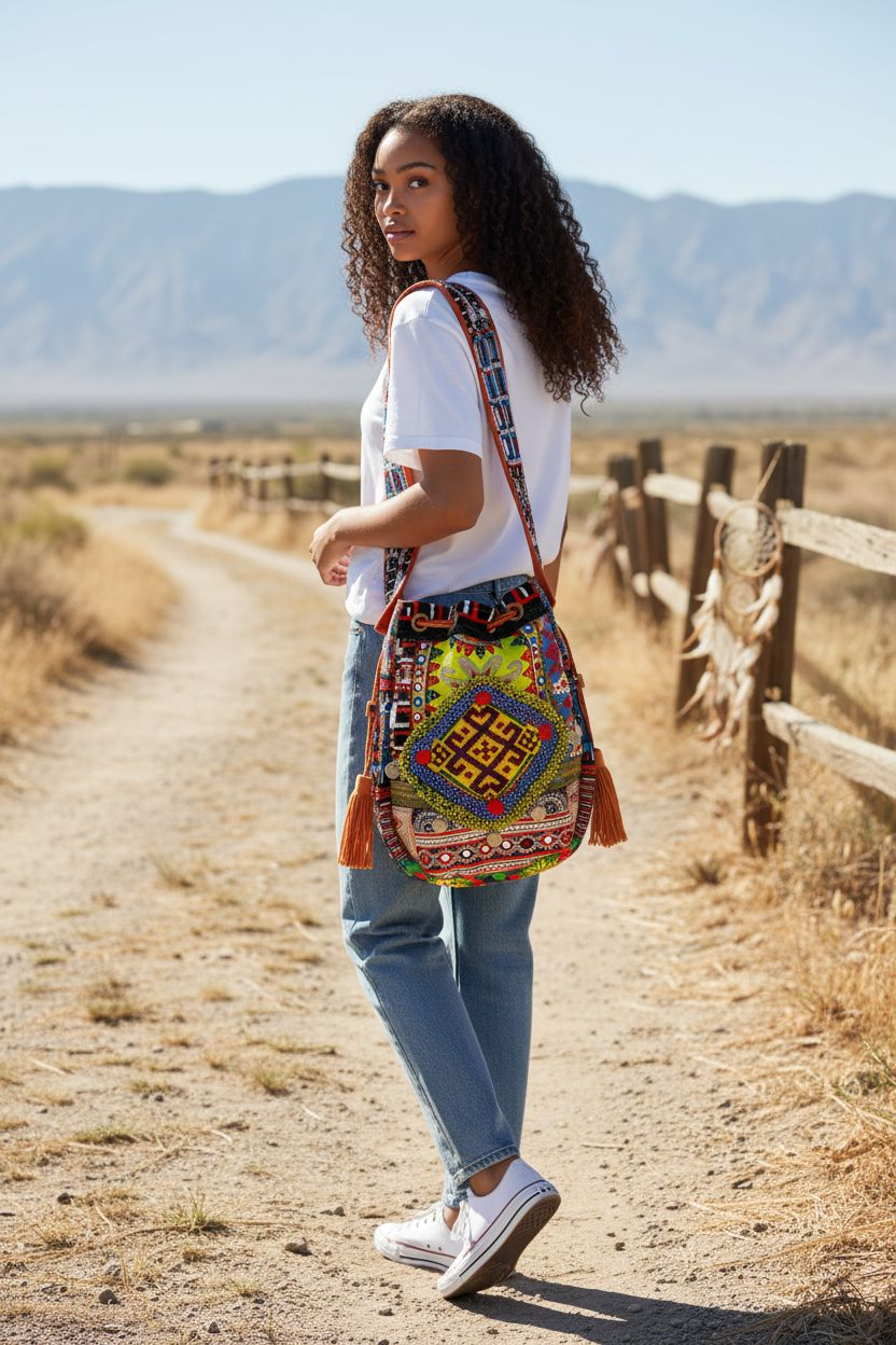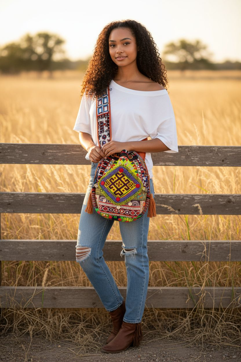 • Voorzijde van multicolour-aztecstof met prachtige banjara applicatie, omringd met kraaltjes & zilveren muntjes