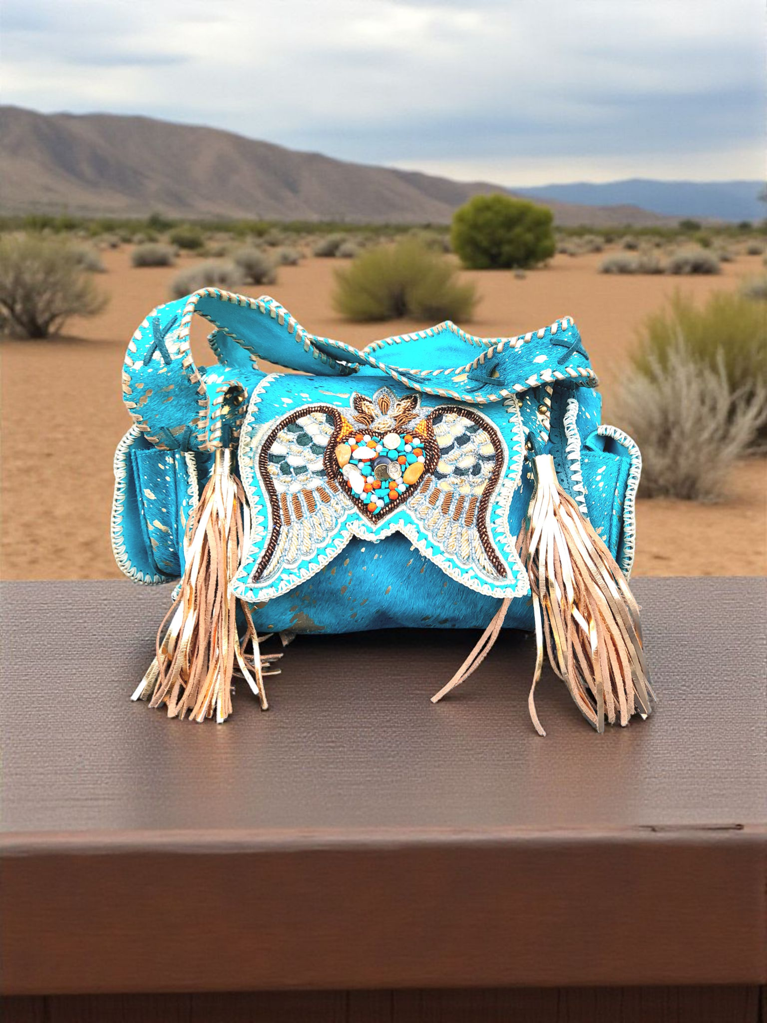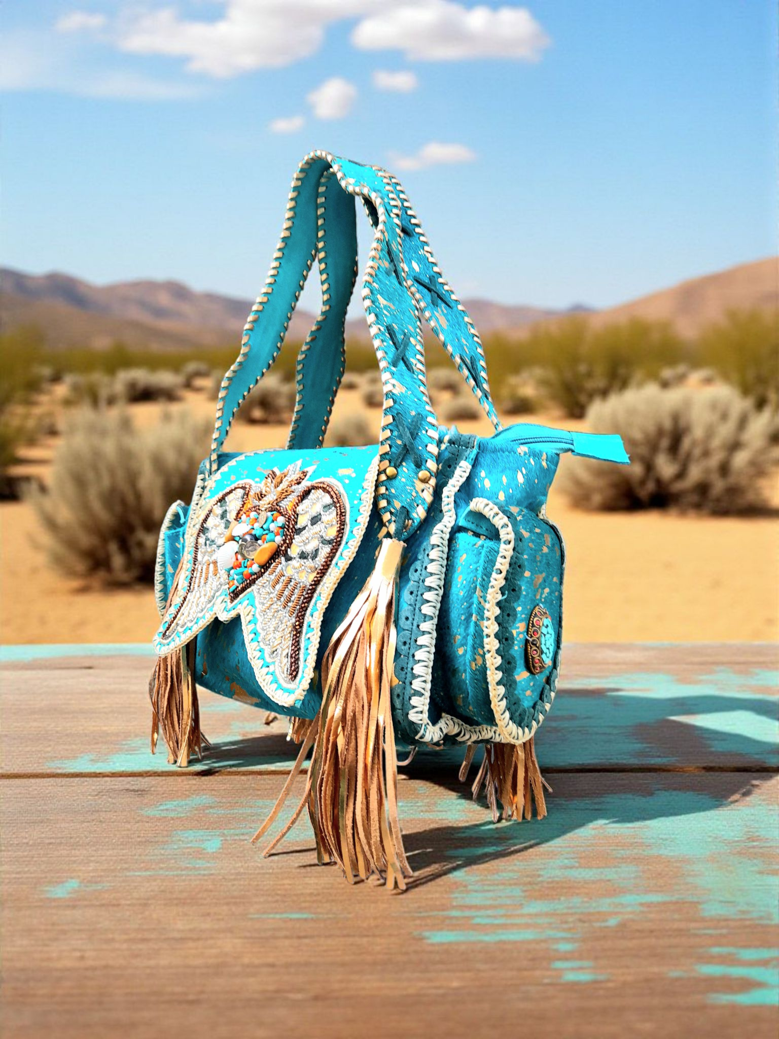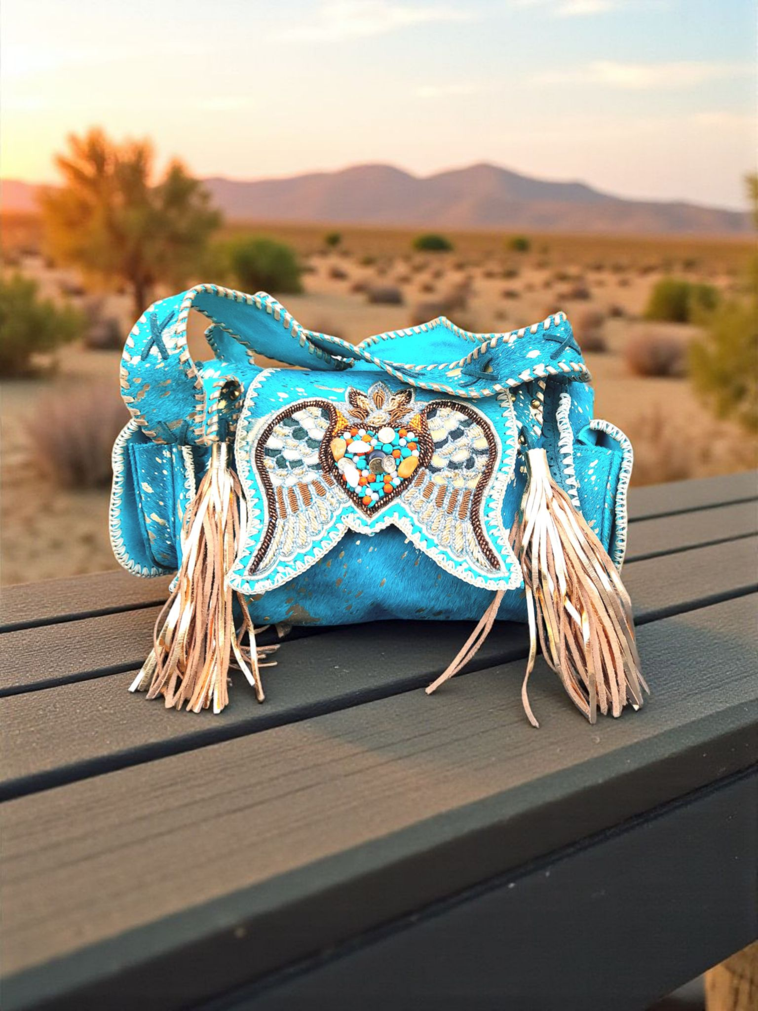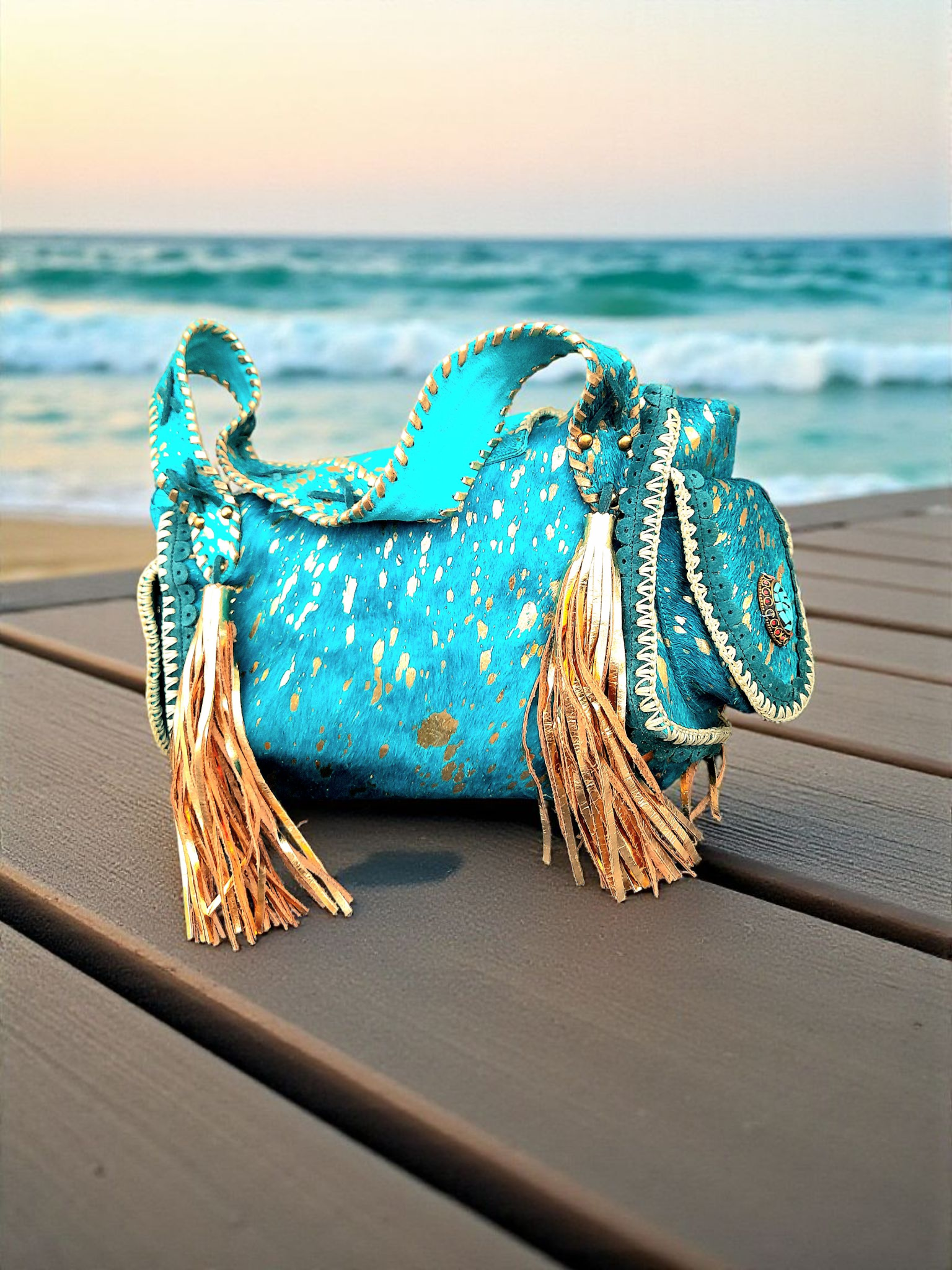 • Zijkanten afgezet met kleine zakjes met gave turquoise steen