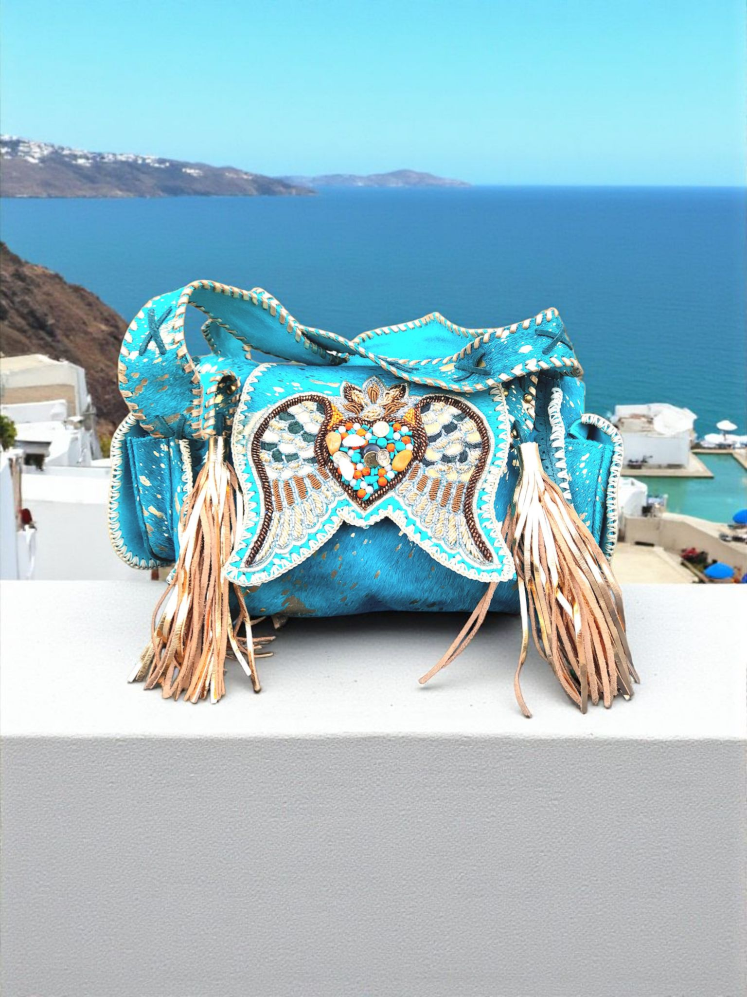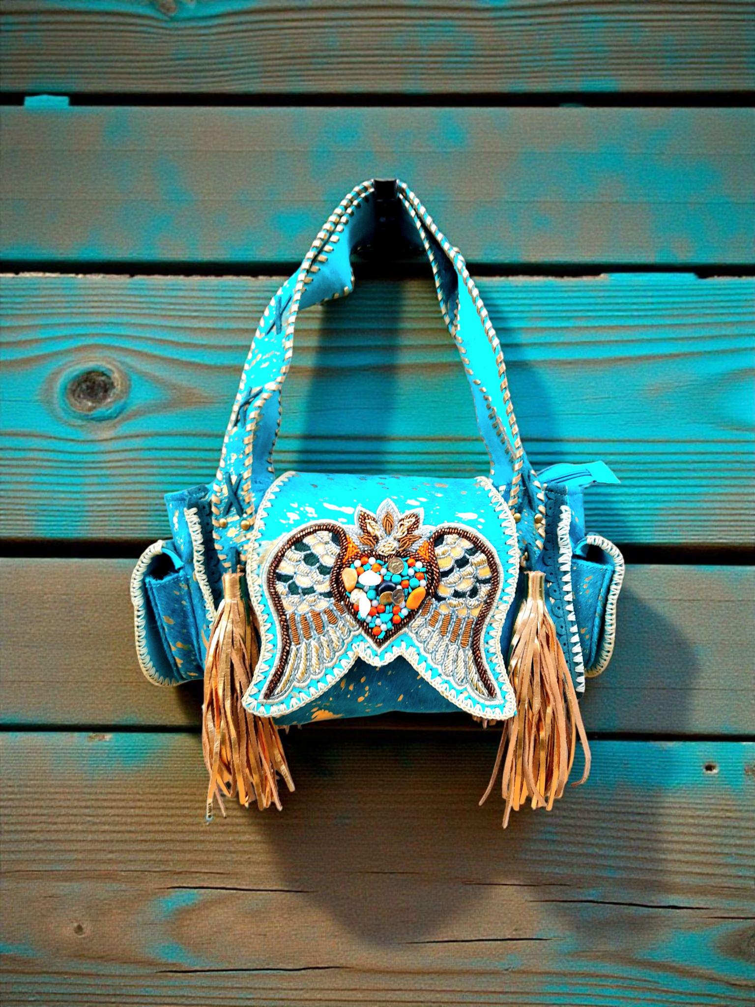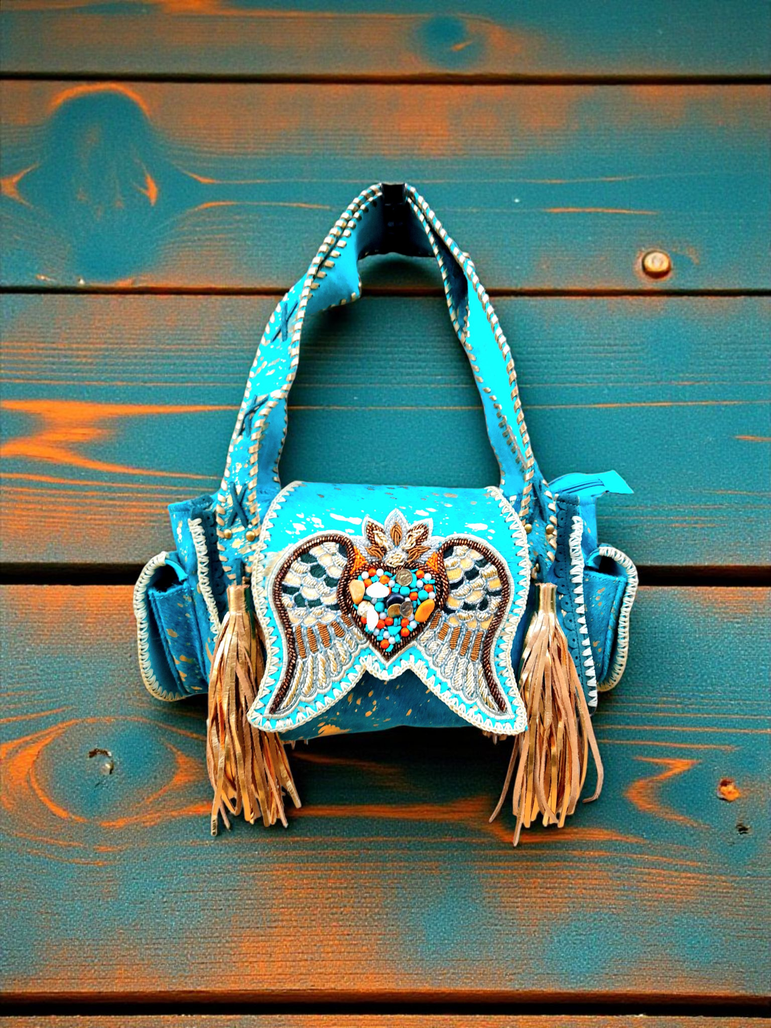 •  Voorzijde van turquoise huid met gouden accenten, afgezet met prachtige applicatie van verschillende kleuren kraaltjes