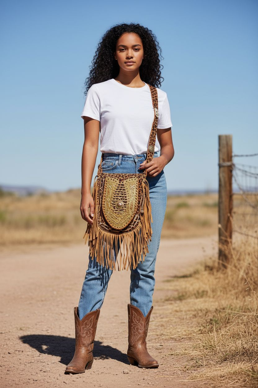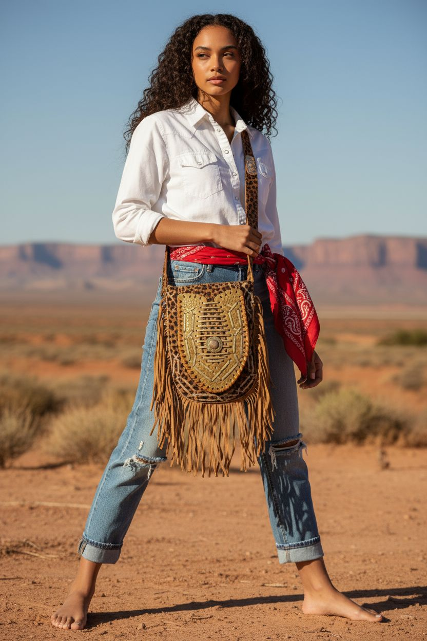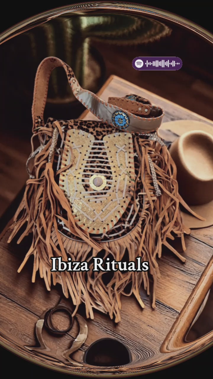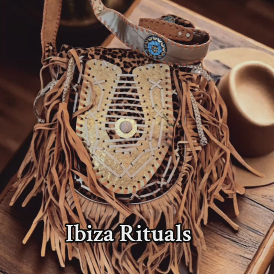 • Prachtige grote tas van huid met dieren-print & voorflap bewerkt met goudkleurig leer, bruine suède fringe en gave goudkleurige applicatie met beige steen
