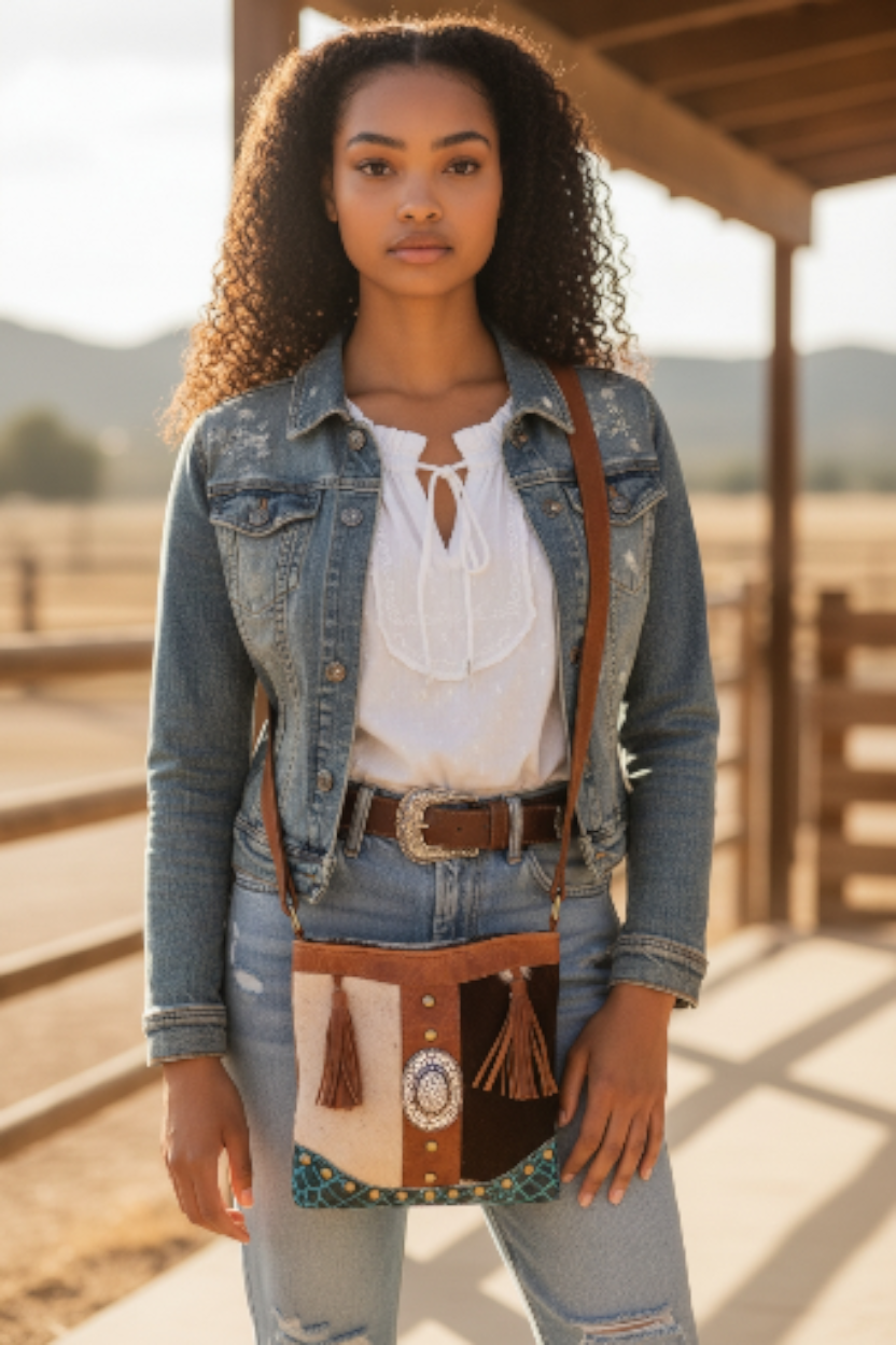 • Voorzijde van huid, leer & bronskleurige studs, en gave steen